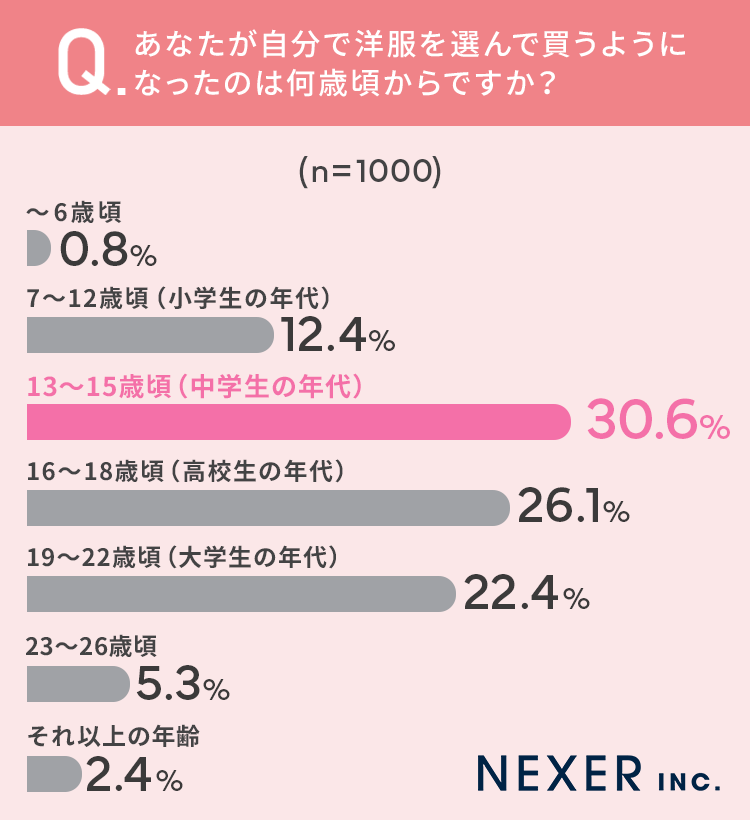 自分で洋服を選んで買うようになった年代を調査したところ、「中学生の頃」が30.6%で最多でした。
