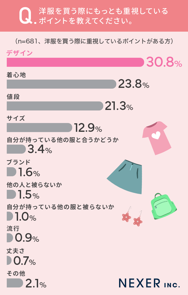 また洋服を買う際に重視しているポイントでもっとも多かったのは、30.8%の方が選んだ「デザイン」でした。