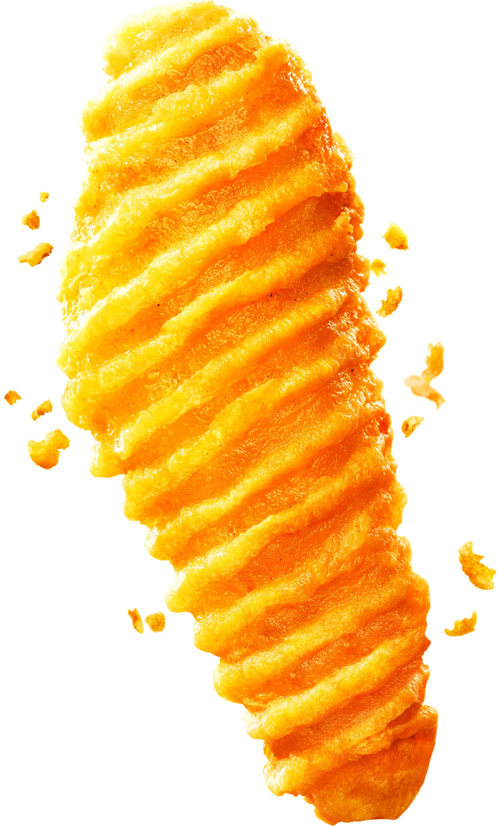 このたびリニューアルしたクリスピーチキンは、1.2倍(※)にボリュームアップし、しっかりと食べ応えのあるお肉感が楽しめ、むね肉ですがしっとりとした食感に仕上がっております。惜しくも負けてしまった「衣派」のみなさんにも注目いただきたいのはクリスピーチキンの衣です。サクサクしてウェーブ感が出るように、独自の衣付け機械を導入いたしました。衣の改良については、約2年前から着手しており、独自の衣の配合にもこだわることで特徴的な見た目と食感に仕上げています。