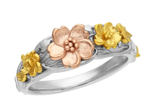 日本の伝統的な彫金技術「高肉彫り」の美を、現代の技術で甦らせたジュエリー。かつて刀装具を飾った職人たちが生み出した、立体的な彫りの技と風雅なモチーフを受け継ぎ、最新テクノロジーで再構築。リングには、桜と紅葉、流水を組み合わせた「流水雲錦文様」に着想を得て、過去から受け継がれてきた“和の記憶”を、今を生きる自分に重ねられるようデザインしました。