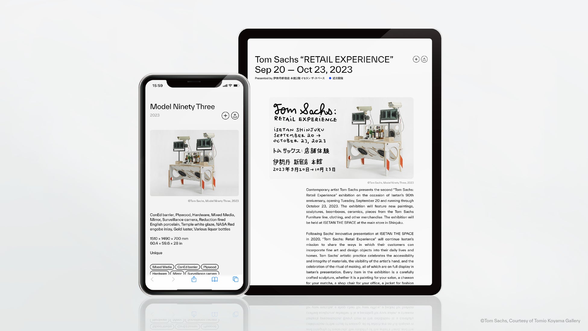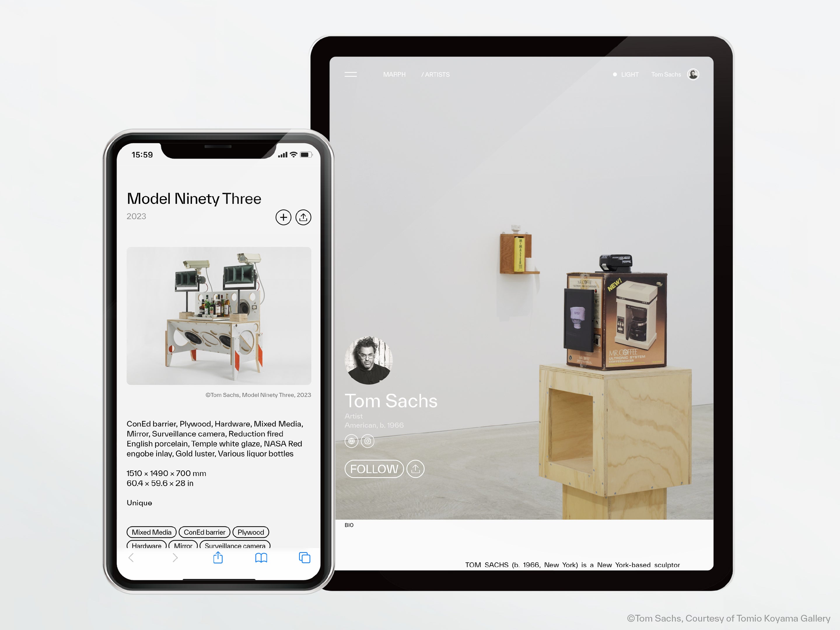 本機能を活用する第一弾は、ニューヨークを拠点に活動するコンテンポラリーアーティスト、トム・サックス(https://marph.com/artists/tomsachs)。9月20日(水)から10月23日(月)まで新宿伊勢丹店2FのISETAN THE SPACEで開催する「トム・サックス:店舗体験」の展示ページをMARPH上に開設し、会場で展示される一部の作品がMARPH上で閲覧可能となります(販売は行いません。販売は全て伊勢丹新宿店で可能です)。また、2019年に東京オペラシティ アートギャラリーで開催された「ティーセレモニー」と、小山登美夫ギャラリーで開催された「Smutshow」や「茶碗」などの過去展示についても、MARPH上にて一部の作品のアーカイブビューが可能となります。