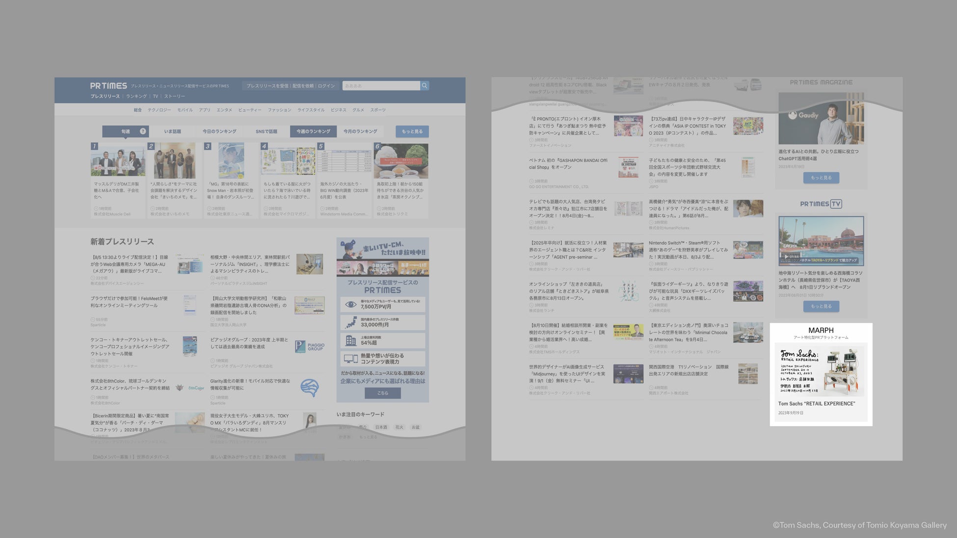プレスリリース配信サービス「PR TIMES」サイトのトップページに「MARPH」に掲載されているアート情報への導線を開設しました。これにより、「MARPH」で発信されたアーティストやギャラリー発のプレスリリースへ「PR TIMES」サイト右側のエリアに新設されるバナーリンクから遷移可能となります。