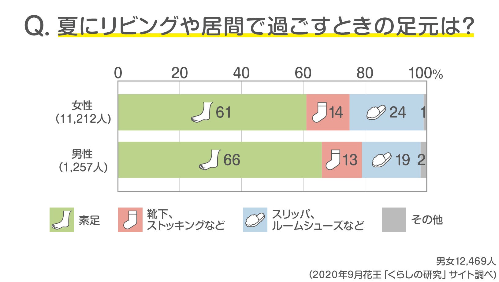 高温多湿の日本では「夏は裸足で過ごしたい」という人が多く、「くらしの研究」サイト読者も夏のリビングでの足元は男女ともに「素足」が6割を超えています。しかし、男女の冷房温度の体感の違いの影響に加え、素足の快適さの一方で素足になることで床が汚れやすくなることを気にする女性ならではの配慮もあってか、女性の4人に1人は夏でもスリッパ着用(男性は2割未満)という結果でした。