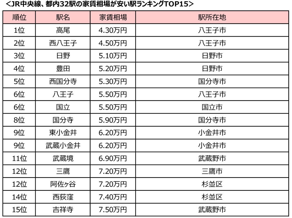 JR中央線、都内32駅の家賃相場が安い駅ランキングTOP15 1位高尾、2位西八王子、6位八王子と八王子市の駅が最多のランクイン!