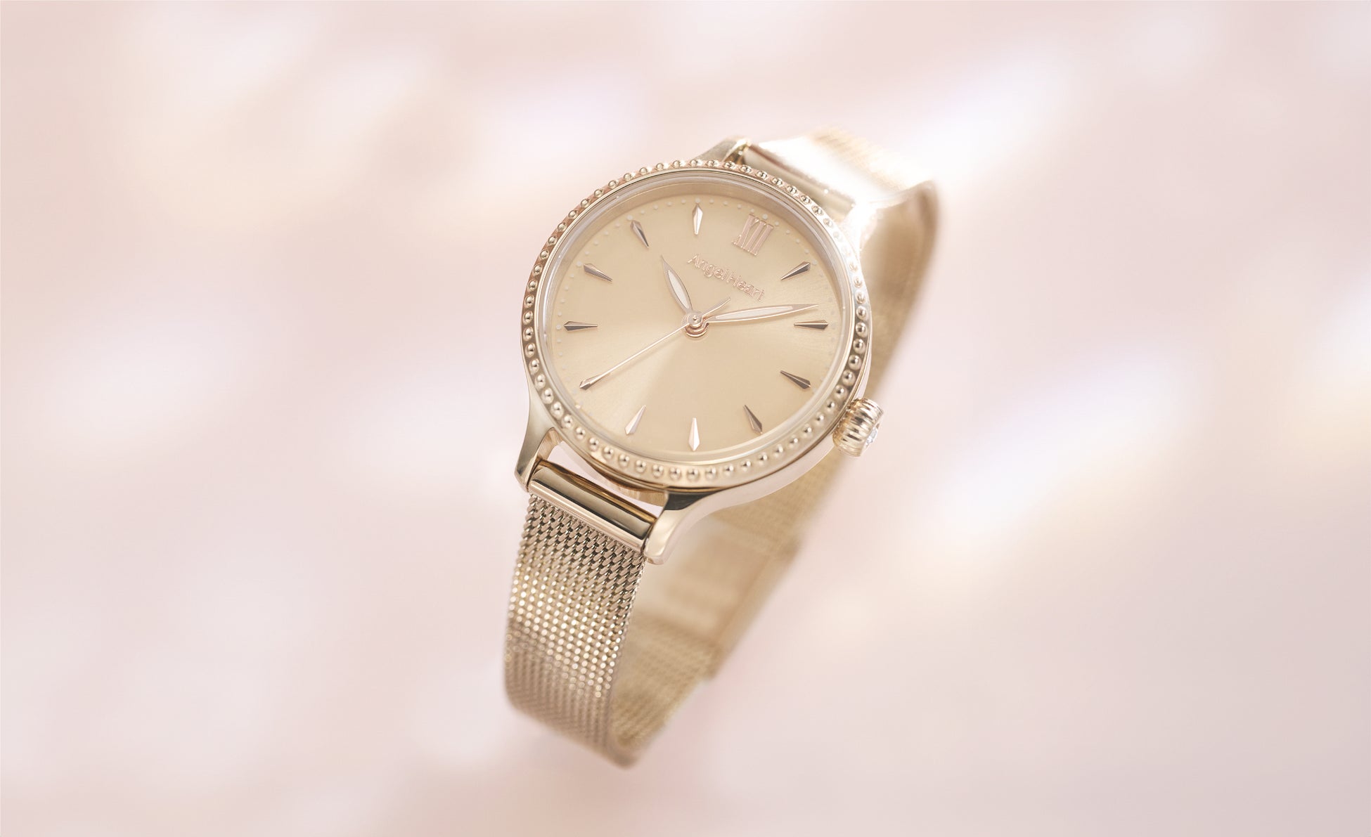 ケースとブレスレットに施した新色『プレシャスゴールド』に、光の当たり方によって放射線状に艶めくサンレイ仕上げを施したピンクベージュの文字盤を合わせました。ブレスレット、文字盤共に肌なじみの良いカラーリングです。