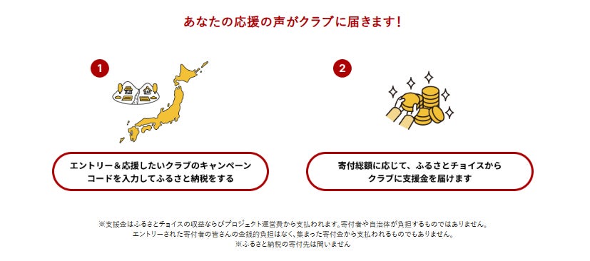 ・ 寄付者が2024年11月25日~12月31日の期間中にふるさとチョイスを通じて事前エントリーし、応援しているB.LEAGUEクラブを選んだうえでふるさと納税をすると、寄付総額に応じてふるさとチョイスが「支援金」を拠出し、クラブへ届ける取り組み
