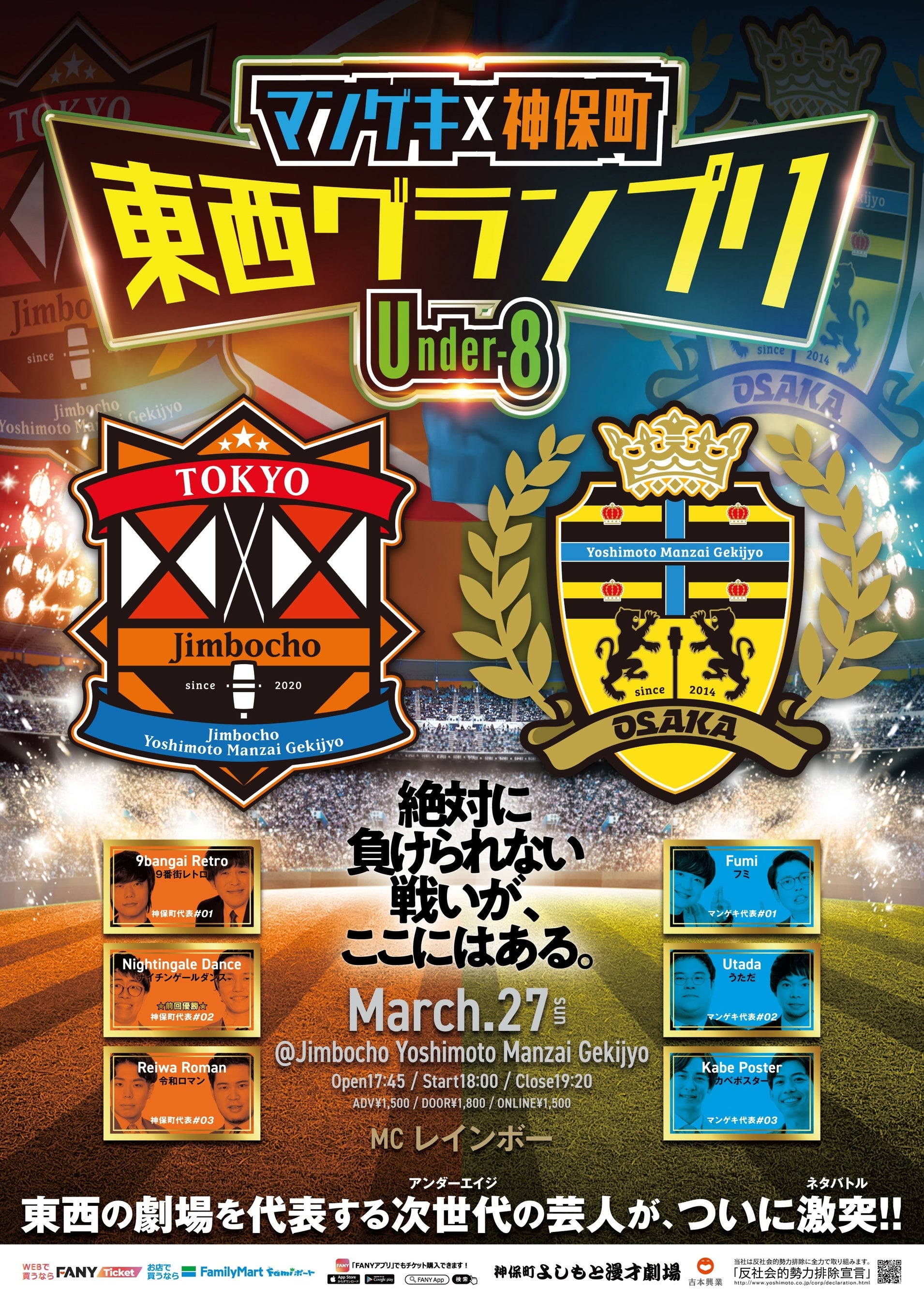 大阪・難波にある「よしもと漫才劇場」と、東京・神保町にある「神保町よしもと漫才劇場」はこの度、よしもと漫才劇場を盛り上げるべく、バトルイベント「マンゲキ×神保町 東西グランプリ 〜Under-8〜」第二回大会を開催いたします。