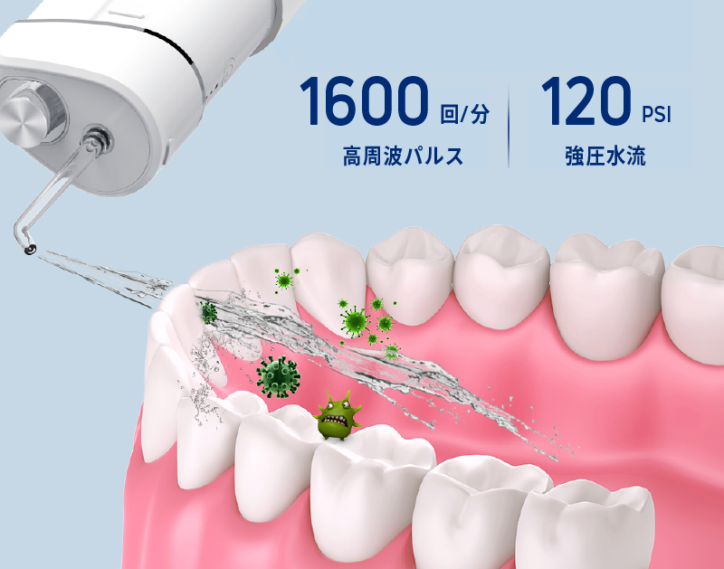 - ストロング- 1800回/分で強い水圧で歯の間の小さな汚れまでを落とします。