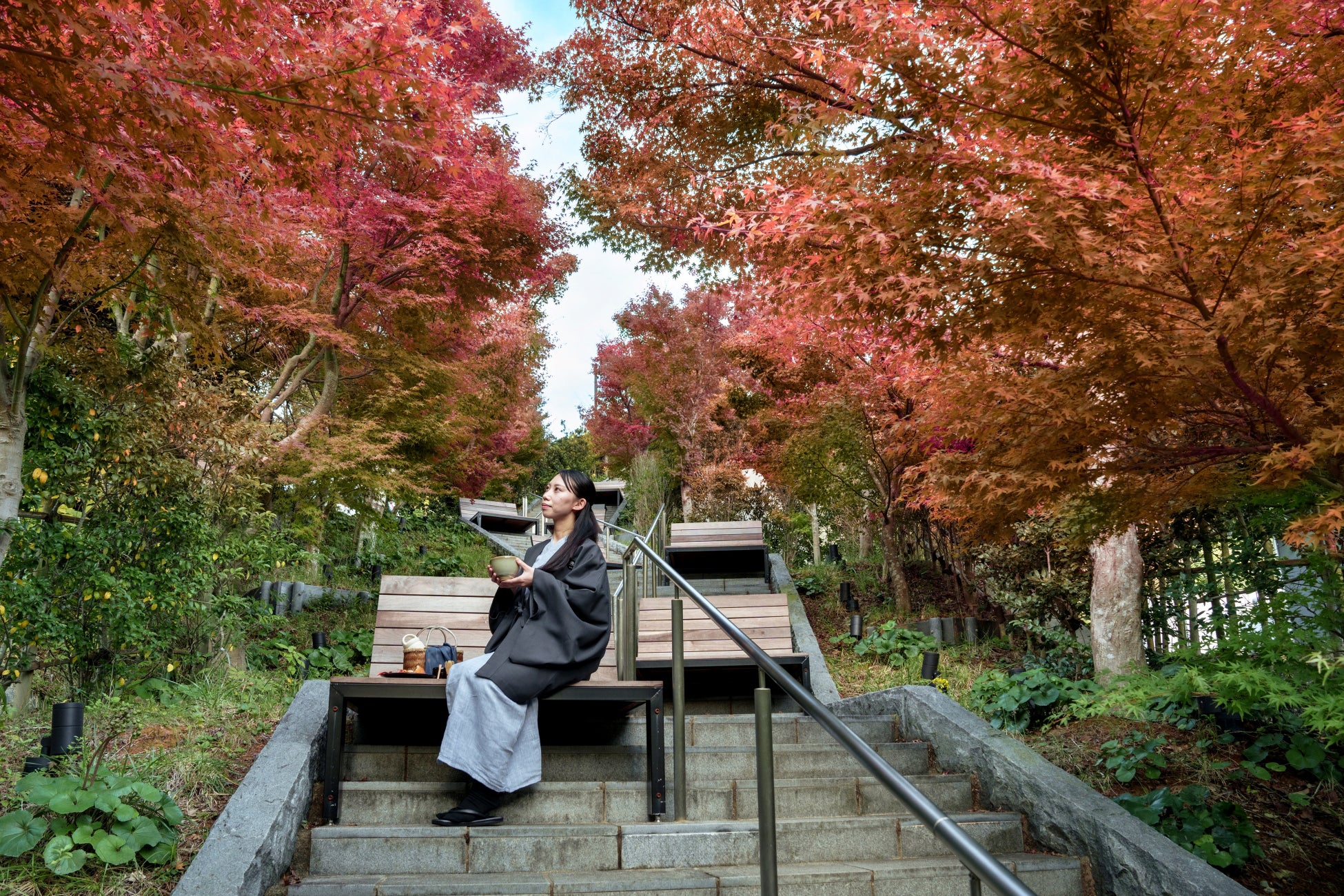 「オソト天国」と称される長門湯本温泉の景観は、四季折々の魅力に溢れています。春は音信川沿いの桜が温泉街を桃色に彩り、初夏の夜には蛍の光が舞い、人々の心を癒します。秋には「紅葉の階段」がもみじを囲む木々の葉が紅く染まり、冬は凛とした空気に包まれ、四季の移ろいを感じることができる温泉街です。川のそよ風や木漏れ日などの都会では感じられない自然の豊かさを感じながら、温泉街の好きな場所でお茶を点て、穏やかな時間を過ごすことができます。