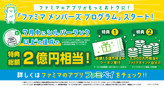 7月中にシルバーランク以上の達成で①1.5億円相当のクーポンの発行、②5,000万円相当のファミマポイントの山分けキャンペーンを実施いたします。