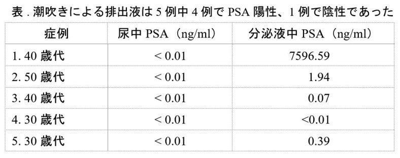 みやびウロギネクリニックの井上院長と荒木教授らのグループは、研究に同意を得た一般女性を対象に、膀胱内へ無害であるインジゴカルミン色素を含む食塩水を注入し、その後に性的刺激により潮吹き現象を誘発して動画に記録。噴出された液体を分析した結果、主成分が尿であることを突きとめました。また、液体中のPSA濃度が尿と比較して高かったことから、スキーン腺からの分泌物も含まれていることが示されました。