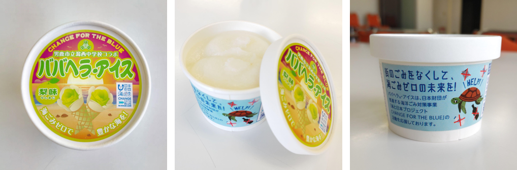 CHANGE FOR THE BLUE in 秋田県実行委員会は、男鹿市立潟西中学校の生徒が考案した「ババヘラ・アイス(カップ)梨味」(有限会社進藤冷菓)とコラボレーションしました。このアイスクリームは、有限会社進藤冷菓とともに企画開発し、道の駅おが なまはげの里オガーレと道の駅あきた港 ポートタワー・セリオンで発売中です。この企画は、日本財団が推進する海洋ごみ対策プロジェクト「海と日本プロジェクト・CHANGE FOR THE BLUE」の一環で開催するものです。