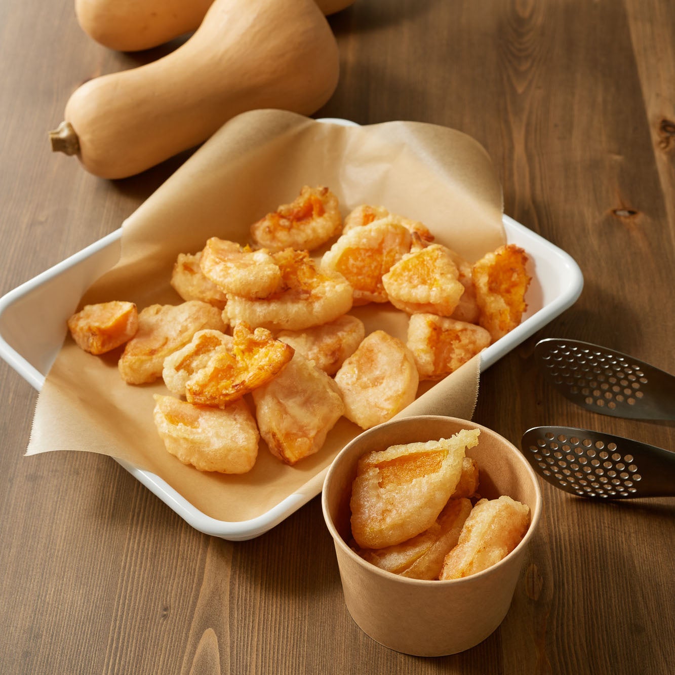 ツカボチャを使用した一品。塩味のあるサクサクの衣をまとわせたバタ