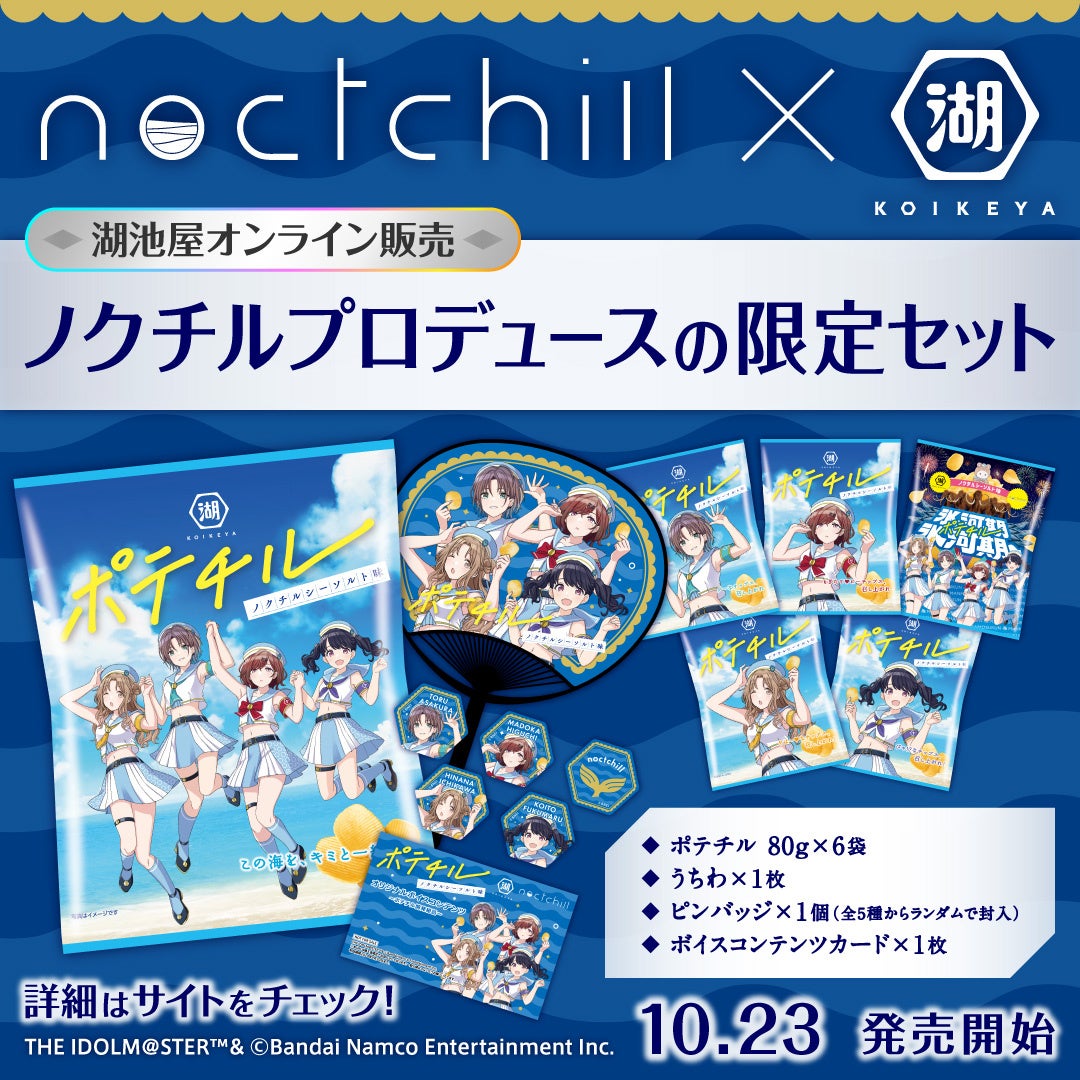 今回発売する「アイドルマスター シャイニーカラーズ「ポテチル」セット」は、283プロダクション所属アイドルのノクチルをイメージしたポテトチップスとオリジナルグッズのセットです。