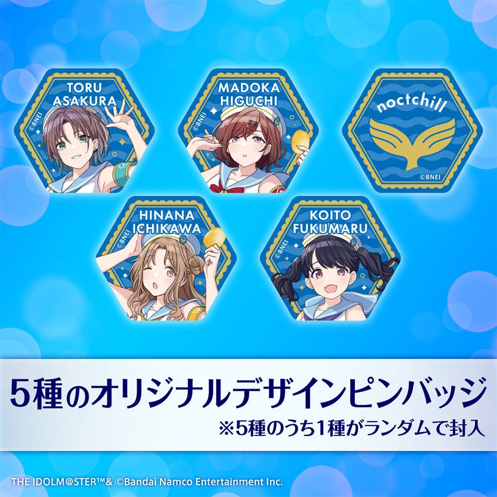 5種類のデザインのピンバッジのうち1種が封入されており、ライブグッズとして定番のうちわ、さらに特別に収録した購入者限定のオリジナルボイスドラマを聞くことができるボイスコンテンツカードを付属。商品ビジュアル撮影中のノクチルのメンバーの会話の様子を垣間見ることができます。