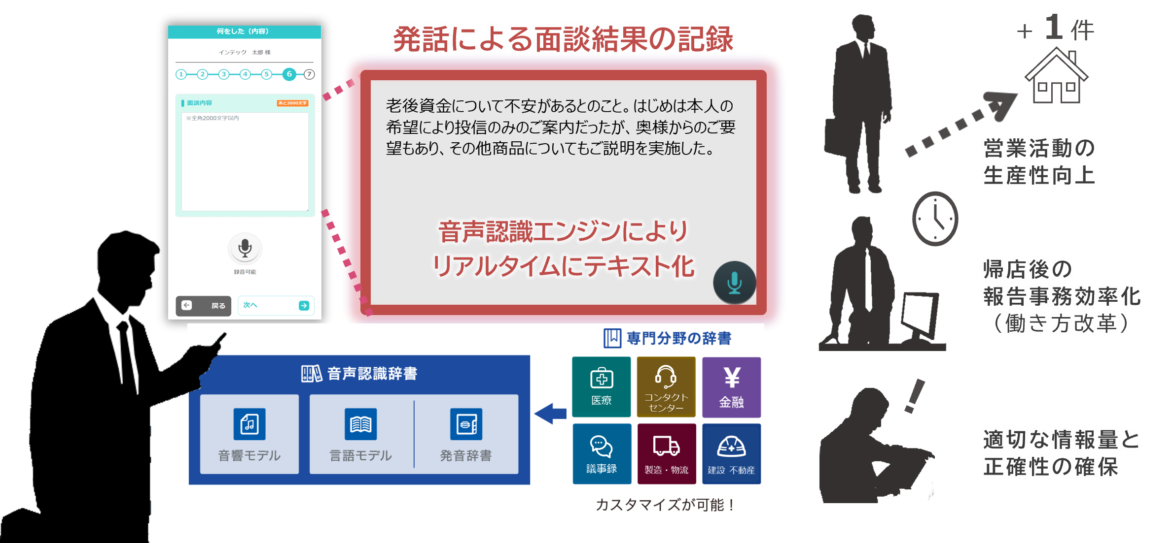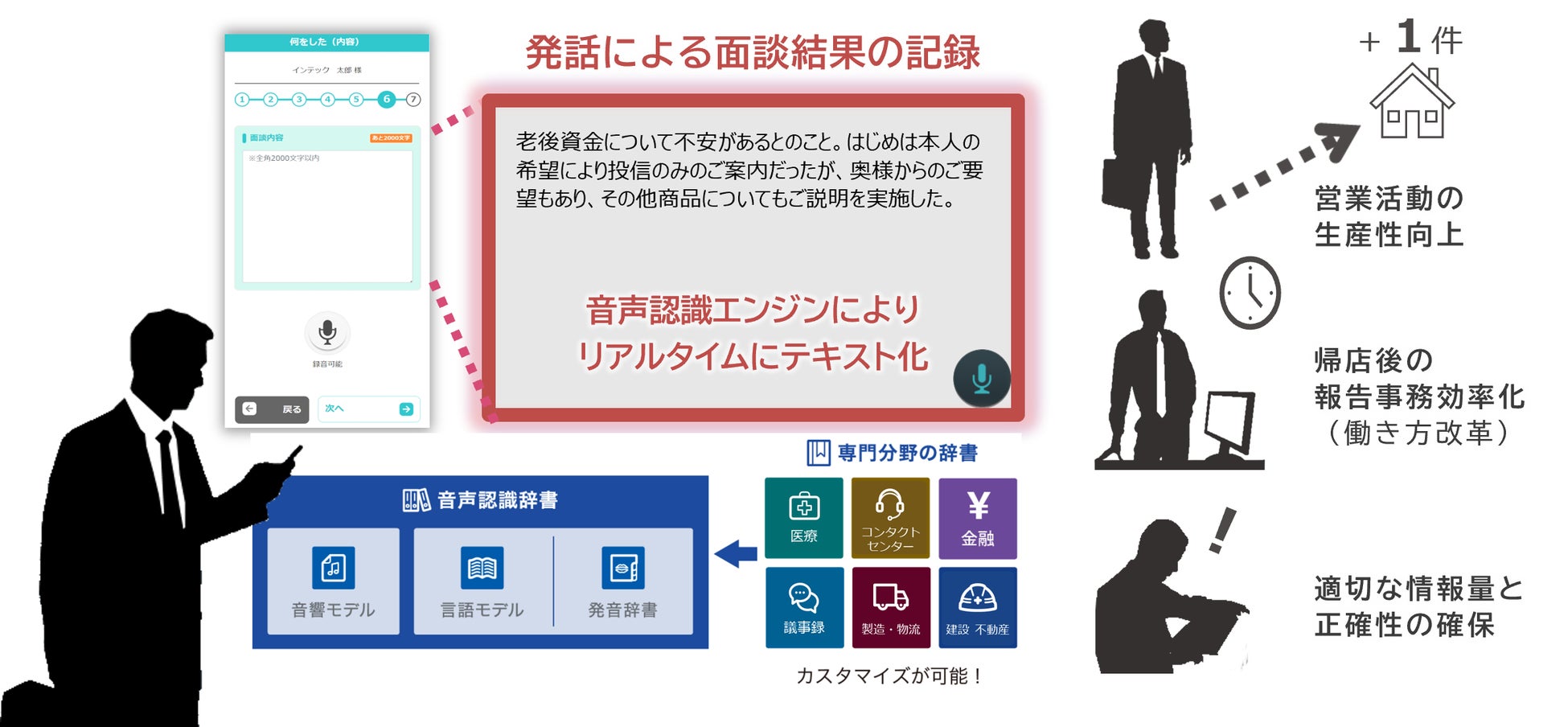 インテックでは、アドバンスト・メディア社と連携し、音声認識スマホアプリによる音声入力での面談記録の登録だけでなく、会話の自動テキスト化(顧客合意のもと実施)や、音声入力で蓄積されたデータをAIでテキスト解析し、コンプライアンスの強化や新たな営業提案につなげるなど、活用場面を広げ、業務高度化を推進してまいります。