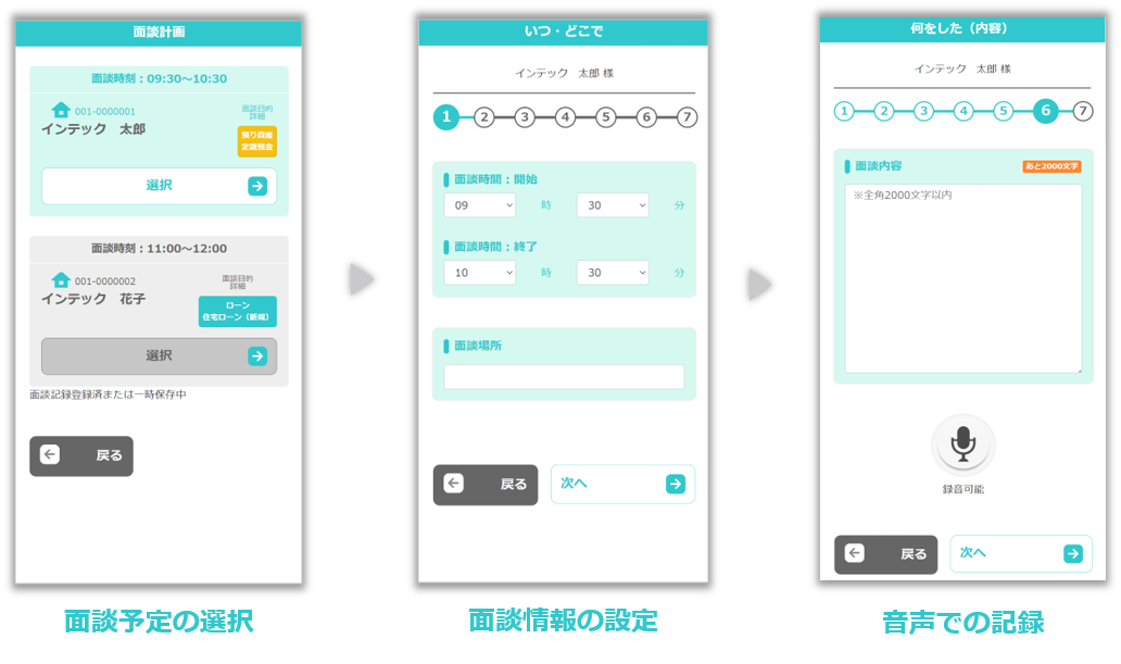音声認識スマホアプリは、インテックの金融機関向け総合情報系ソリューション「F³(エフキューブ)CRMサービス」と連携している、音声入力で顧客との面談記録の作成を完結できるアプリケーションです。営業担当者が次の訪問先へ向かうまでの時間を活用し、顧客と面談した内容を“音声”で記録することができます。重要な営業ネタや顧客の声を、鮮度の高いうちに残すことで、次の営業アクションへの活用や、帰店後の報告事務の簡素化につなげるなど、営業活動の生産性を向上できます。なお、音声認識エンジンは、株式会社アドバンスト・メディアが提供するAI音声認識開発キット「AmiVoice SDK」を採用しております。