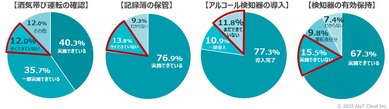 義務化対象企業における対応として必須である4項目すべてに対し、“1割強の企業が対応できていない”ことが判明。道路交通法第9条にて定められている項目であるため、「アルコールチェック義務化」の内容をいま一度正しく理解し、対応を進める必要があります。