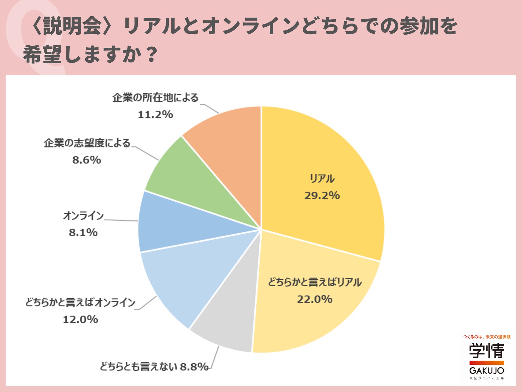 〈説明会〉で希望する参加形式について、「リアル」と回答した学生が29.2%でした。「どちらかと言えばリアル」22.0%を合わせると、半数以上の学生が「リアル」で参加したいとしています。「オンライン」「どちらかと言えばオンライン」の回答は20.1%でした。また「企業の所在地による」は11.2%、「企業の志望度による」は8.6%となっています。「志望度の高い企業は、リアルで参加したい」「開催場所が遠方でなければ、できるだけリアルで参加したい」「直接話を聞くことで、先輩社員の方や会社の雰囲気を知ることができると思う」「どちらも参加したことがあるが、リアルのほうが得られる情報が多いと感じる」などの声が寄せられています。