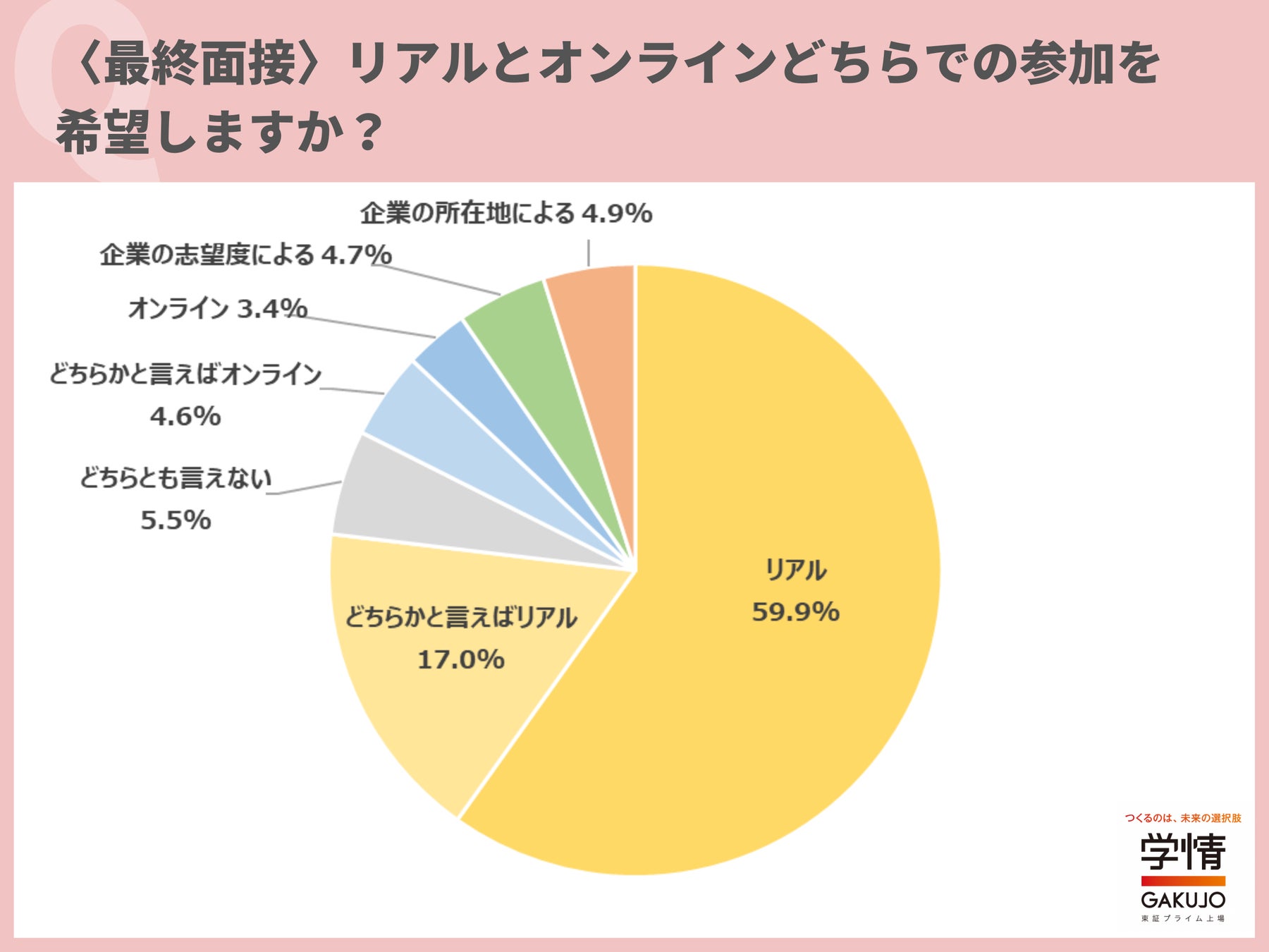 最終面接は「リアル」での参加を希望する学生が約8割。「オンライン」希望は1割未満に留まる。「リアルのほうが、熱意を伝えられると思う」の声
