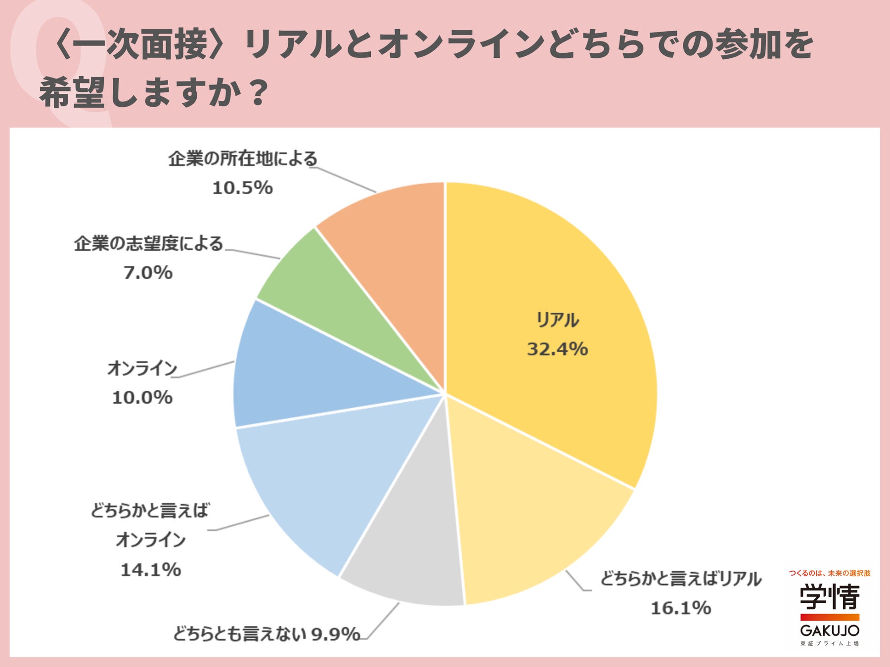 〈一次面接〉で希望する参加形式について、「リアル」と回答した学生が32.4%に上りました。「どちらかと言えばリアル」16.1%を合わせると、約半数の学生が「リアル」で一次面接に参加したいとしています。「オンライン」「どちらかと言えばオンライン」の回答は24.1%でした。また「企業の所在地による」は10.5%、「企業の志望度による」は7.0%となっています。「オンライン面接は、コミュニケーションの間の取り方が難しいと感じる」「一次面接からリアルで参加したほうが、対面での面接に慣れることができると思う」などの他、「一次面接は参加する企業数が多いので、オンラインも活用したい」といった声が寄せられています。