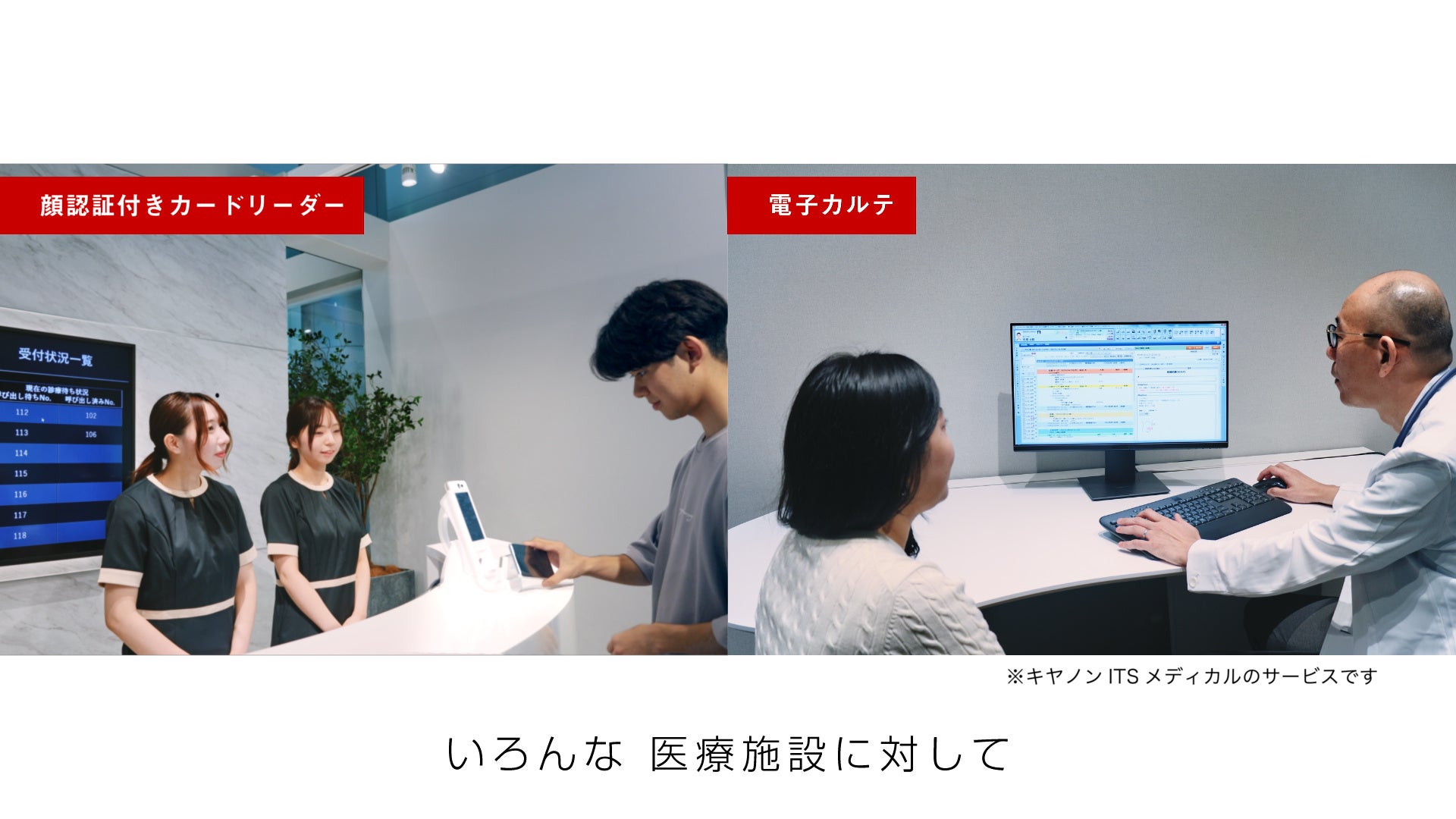 「対談・ヘルスケアDX篇」では顔認証付きカードリーダーと電子カルテシステムを紹介しています。オンライン資格確認用の顔認証付きカードリーダーと、キヤノンITSメディカル株式会社が提供する電子カルテなどの医療ソリューションを通じて、患者の待ち時間削減、院内業務の作業負荷軽減に貢献します。
