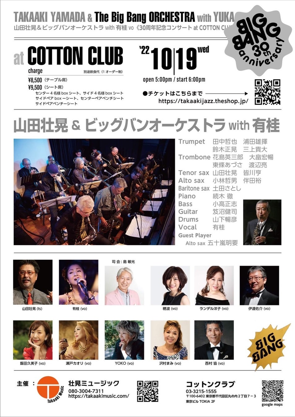 壮晃ミュージック主催、『山田壮晃 & ビッグバンオーケストラ with 有桂vo 30周年記念コンサート at COTTON CLUB』が2022年10月19日 (水)にCOTTON CLUB(東京都千代田区丸の内2-7-3東京ビルTOKIA 2F)にて開催されます。
