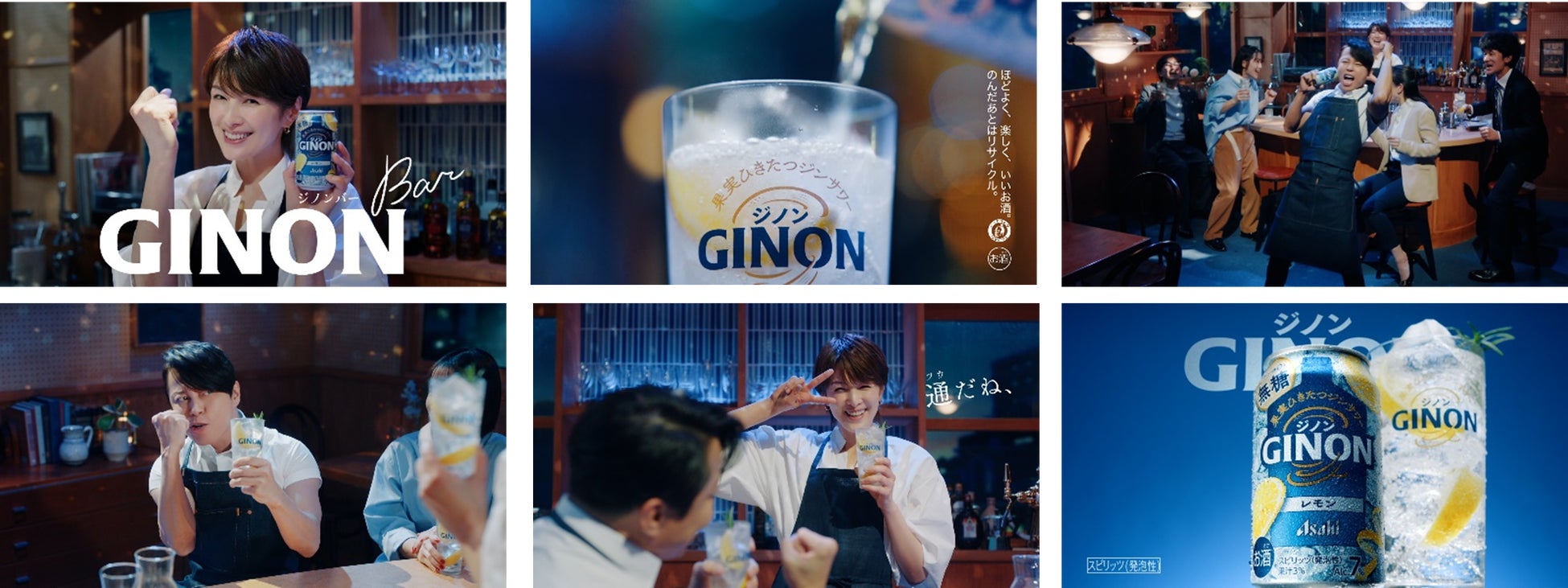 「引き締まってる」篇は、「GINON Bar」の店主の吉瀬さんとバーテンダーの西川さんが来店客と歌いながら盛り上がり、「GINON」を楽しむ様子を描いています。西川さんがフィンガー5の「学園天国」の冒頭部分を替え歌にして「ジーン・ジン・ジン・GINON」と歌った後に、吉瀬さんと来店客の「キンキンに冷やすとうまい」という掛け声を通じて、冷やすほどに果実味が引き締まることを訴求しています。