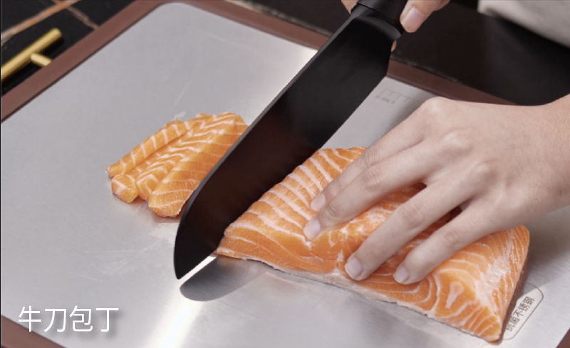 大きな刃の重みを使い、肉や魚、野菜を切ったり、食材を刃の平面で潰すことができます!