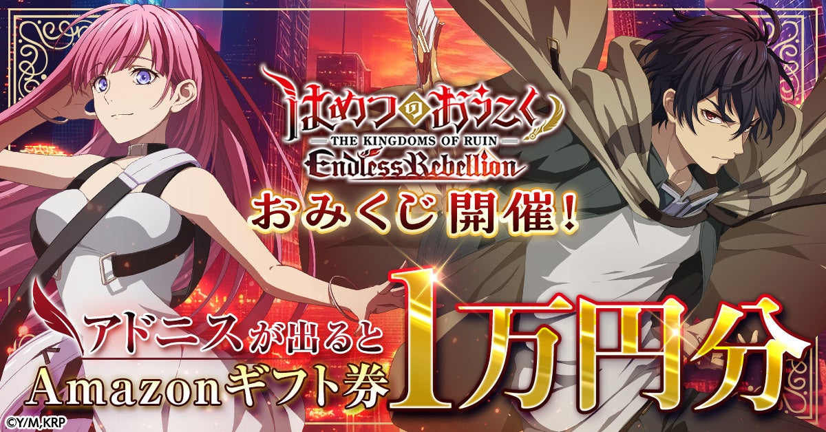 公式X(旧Twitter)内の対象の投稿からゲームを始めると、『はめつのおうこく』のキャラと今日の運勢がゲームプレイ中に表示されます。大吉の「アドニス」が表示された方はAmazonギフト券1万円分がもらえます。さらに表示されたおみくじは、デジタル壁紙として利用できるので、毎日ログインして全種集めましょう!