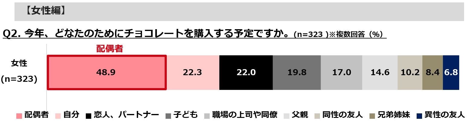 一方女性は、今年のバレンタインチョコレートの購入予定を年代別で見ると同年代の20代女性は購入予定が48%と半数を割っており、しかも、贈り先として「自分」と回答した人の割合が3割弱と、他の年代より高い傾向が見られました。