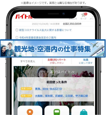 ディップ株式会社(以下「当社」)は、10月からの水際対策緩和や記録的な円安、全国旅行支援開始によるインバウンド、国内旅行需要の増加に伴う観光地の採用活動を支援するべく、「バイトル」にて「観光地・空港内の仕事特集」ページを本日より開設いたしました。