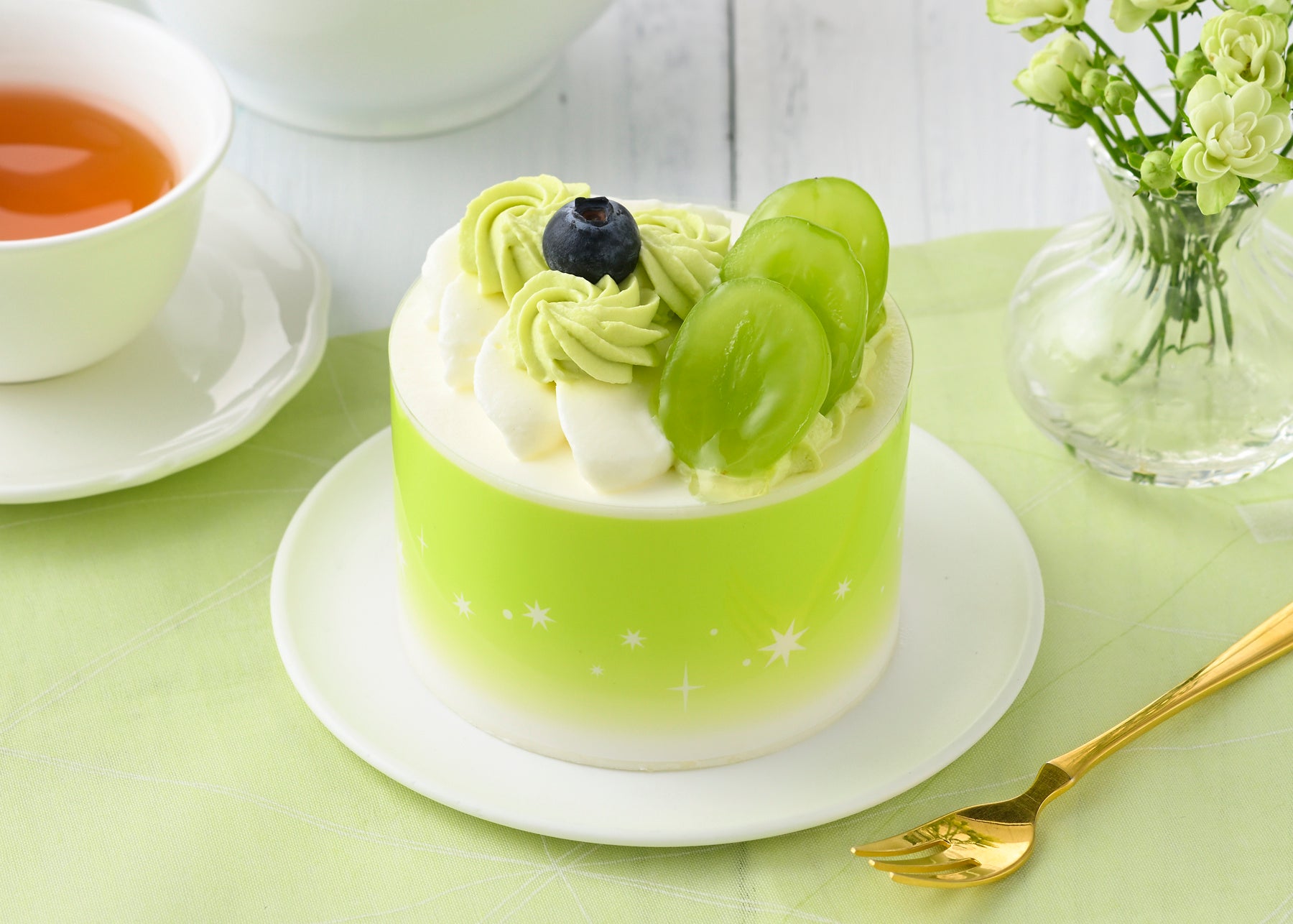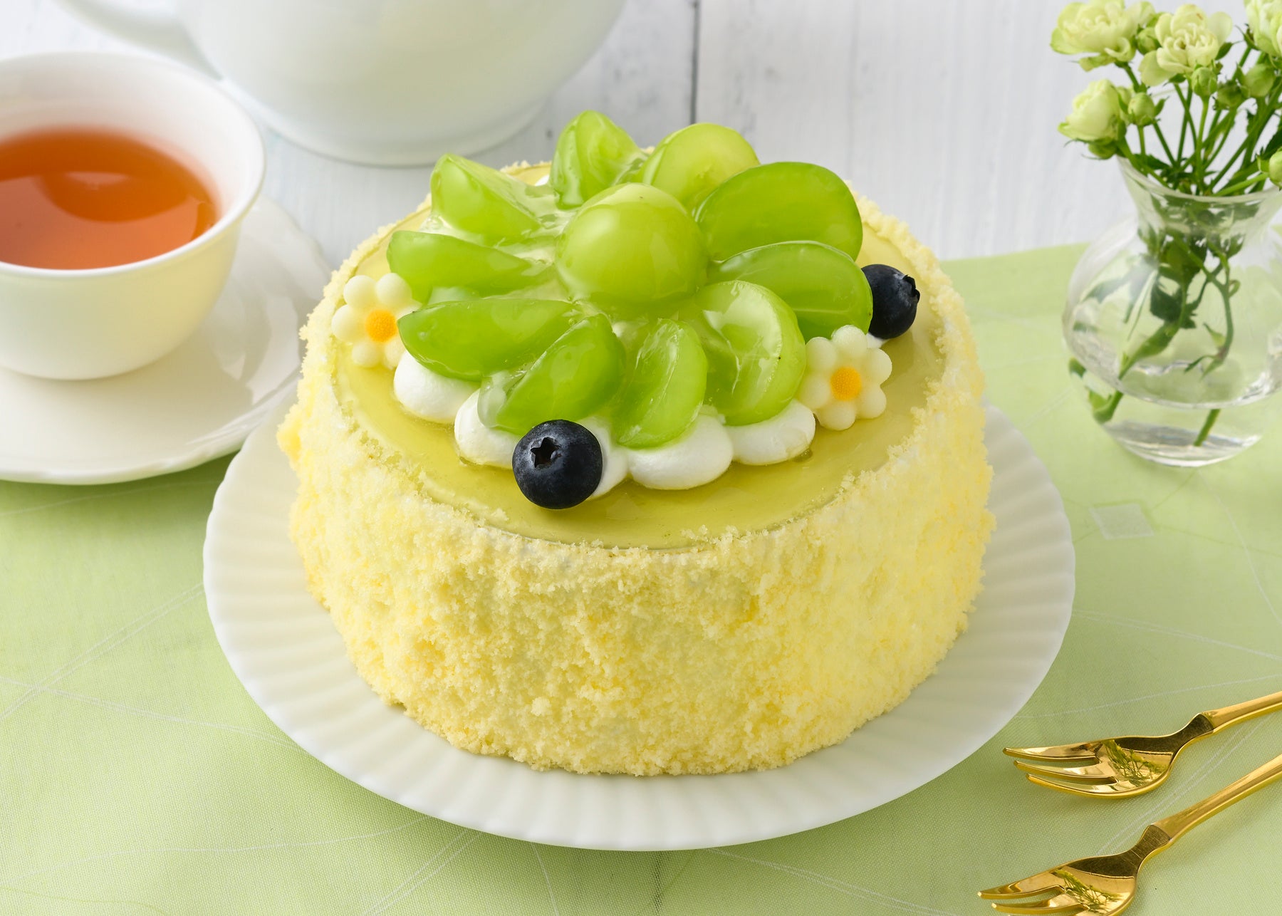 特長:ジューシーな果肉と上品な甘み&香りが特長の旬の果実「シャインマスカット」を贅沢に使用した季節限定のデコレーションケーキです。ふわふわなマスカット風味スポンジにヨーグルト風味クリーム(マスカットゼリー入り)をサンドし、上面はシャインマスカットを満開の花のように飾って華やかに仕上げました。爽やかな味わいのヨーグルト風味クリームが、シャインマスカットのジューシーな味わいをより一層引き立てます。