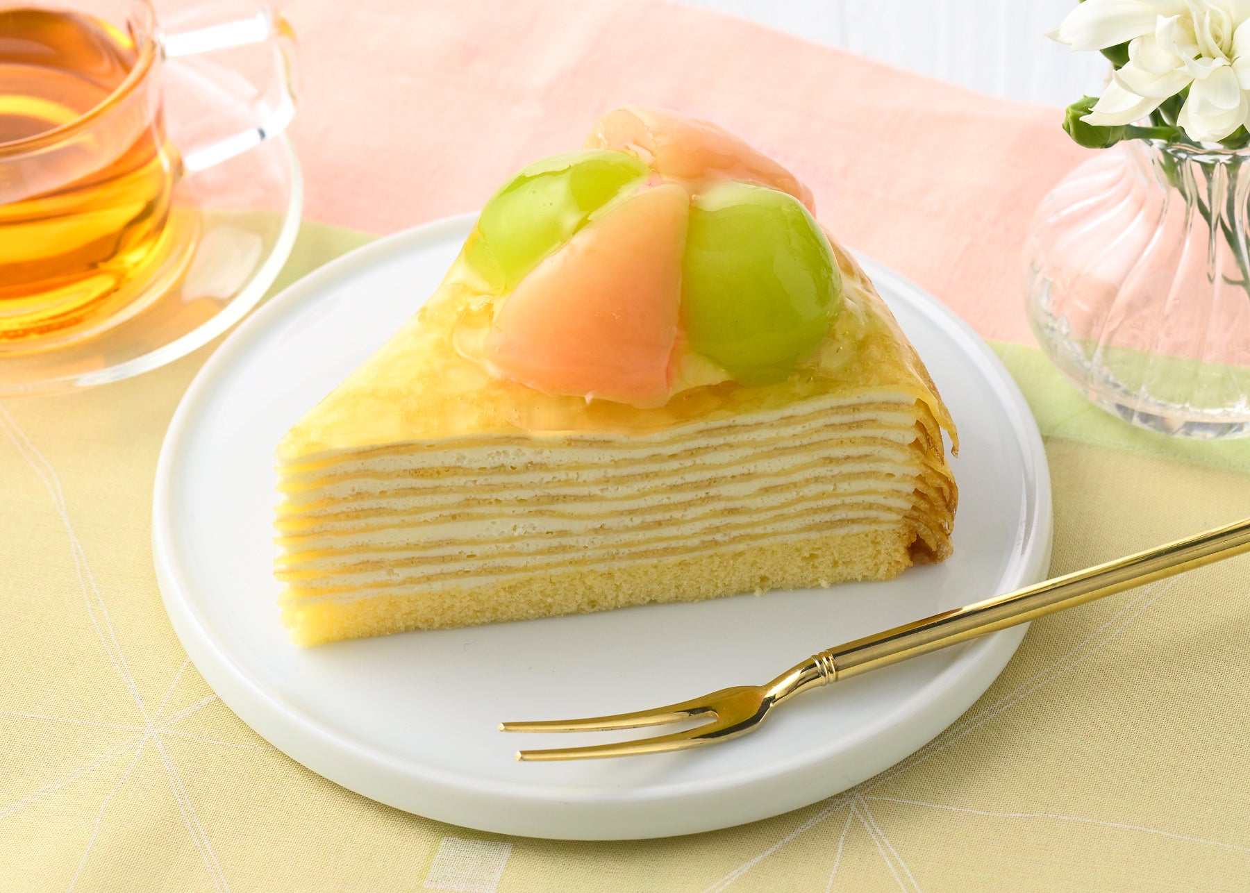 特長:風味豊かに焼き上げた9枚のクレープと、マスカルポーネを使用したまろやかクリームを丁寧に重ね、シャインマスカットと白桃を飾った季節限定のミルクレープです。クレープとクリームの層が織りなすやさしい味わいと、シャインマスカットと白桃のみずみずしく爽やかなハーモニーをお楽しみください。