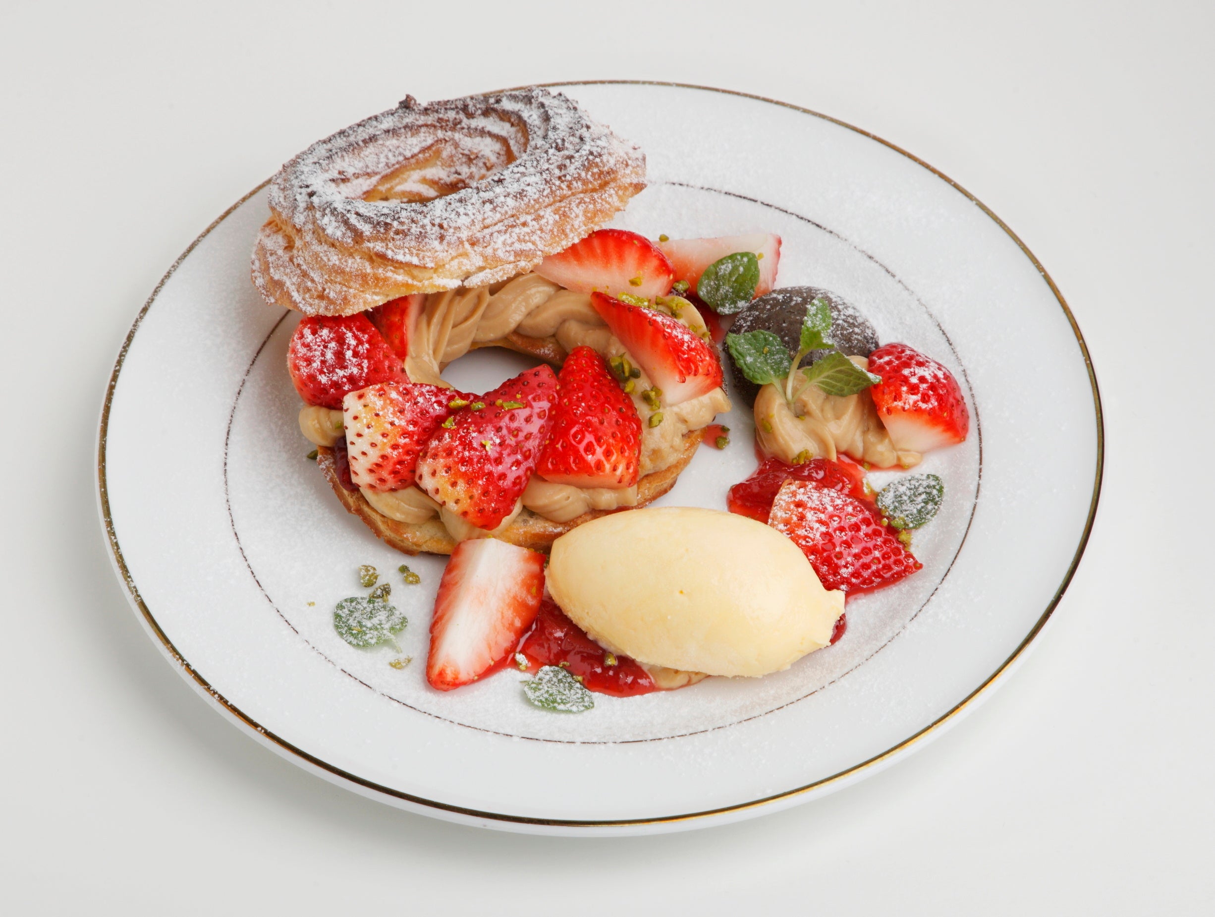 自家製のシュー生地にジャムと高級茶・東方美人のカスタードクリーム・たっぷりのいちごをのせました。