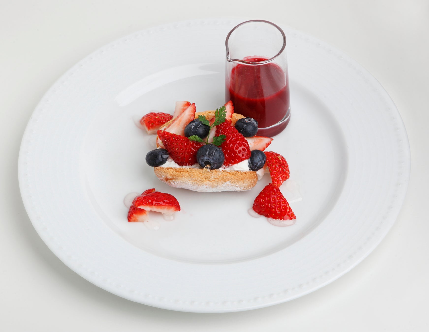 手絞りで焼いた軽いビスキュイ生地に、シャンティクリームといちごをふんだんに使用したひと皿です。