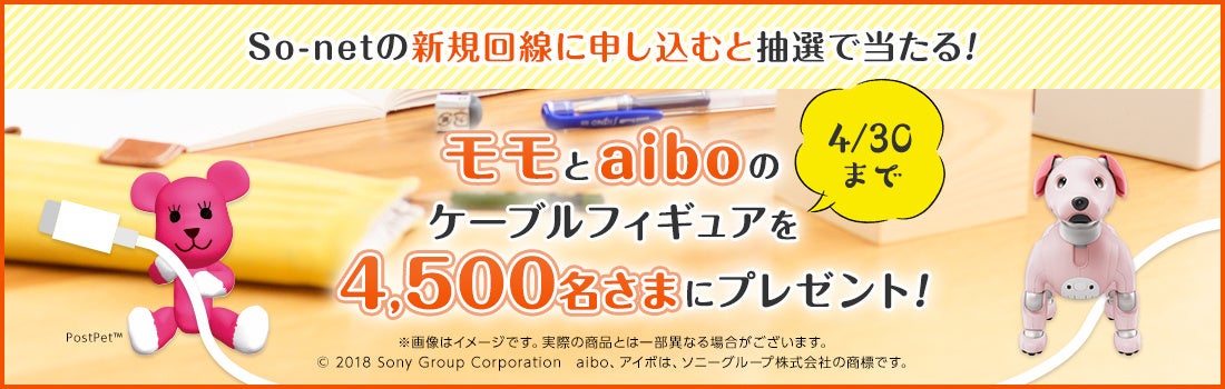 さらに、So-netの回線を新規申し込みされた方には、抽選で4,500名様にモモとaiboのケーブルフィギュアをプレゼントいたします。対象期間中に回線申し込みされた方は自動的にケーブルフィギュアの抽選対象となります。
