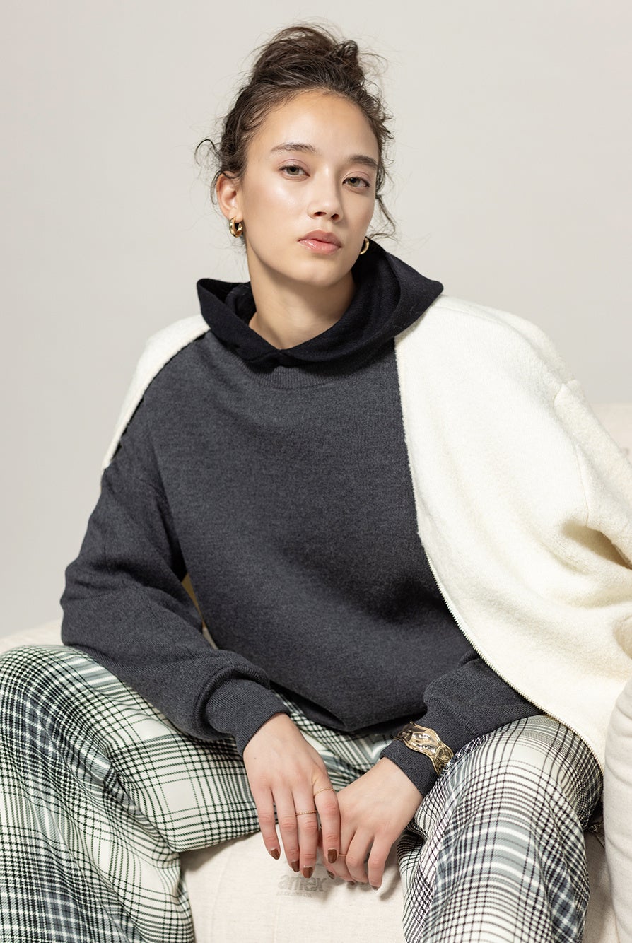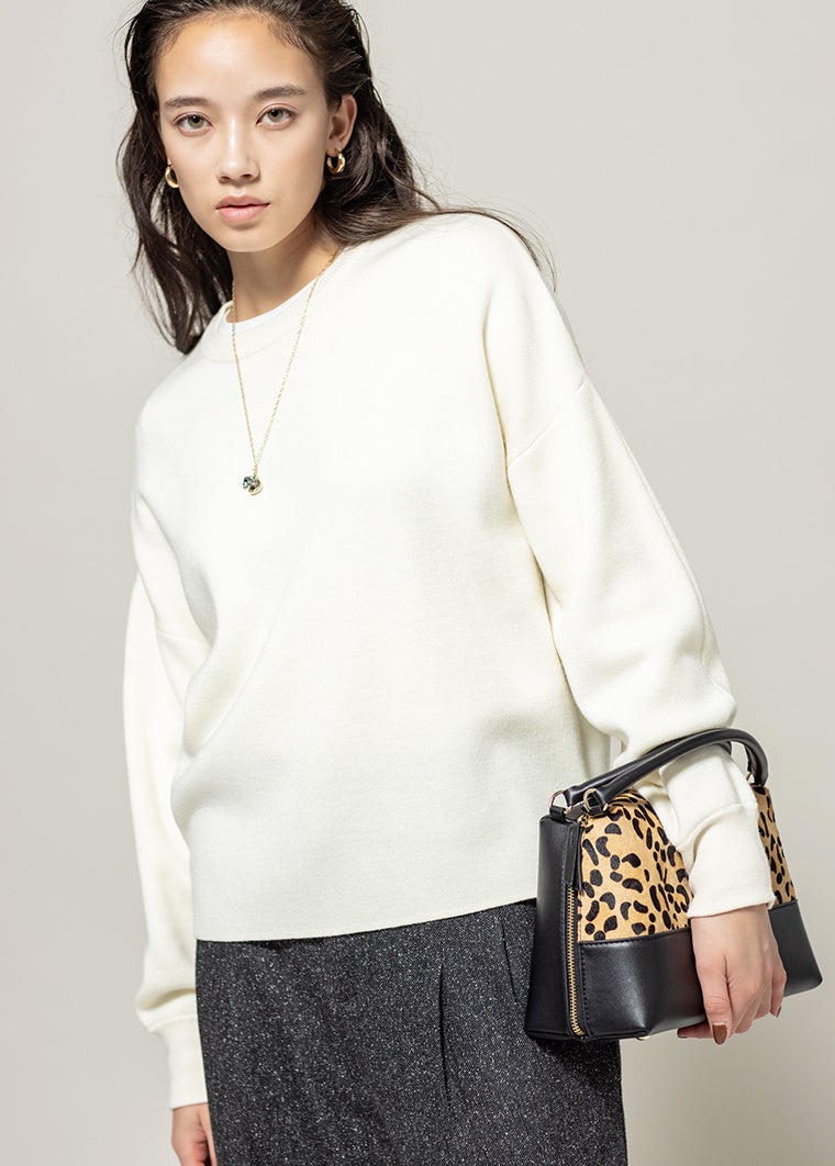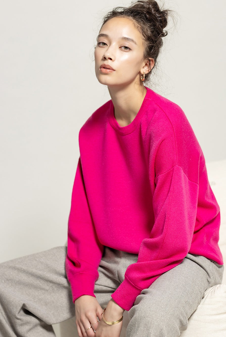 一見スウェットにも見えるリラクシーな印象ながらニットならではの質感や表面感が光る編地に仕上げており、カジュアルにもキレイ目にもどちらにも着こなせる飽きのこないデザインが魅力。