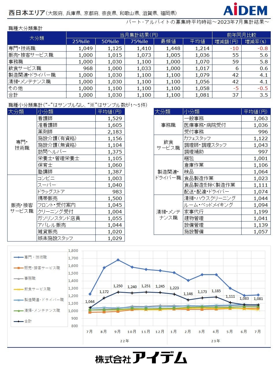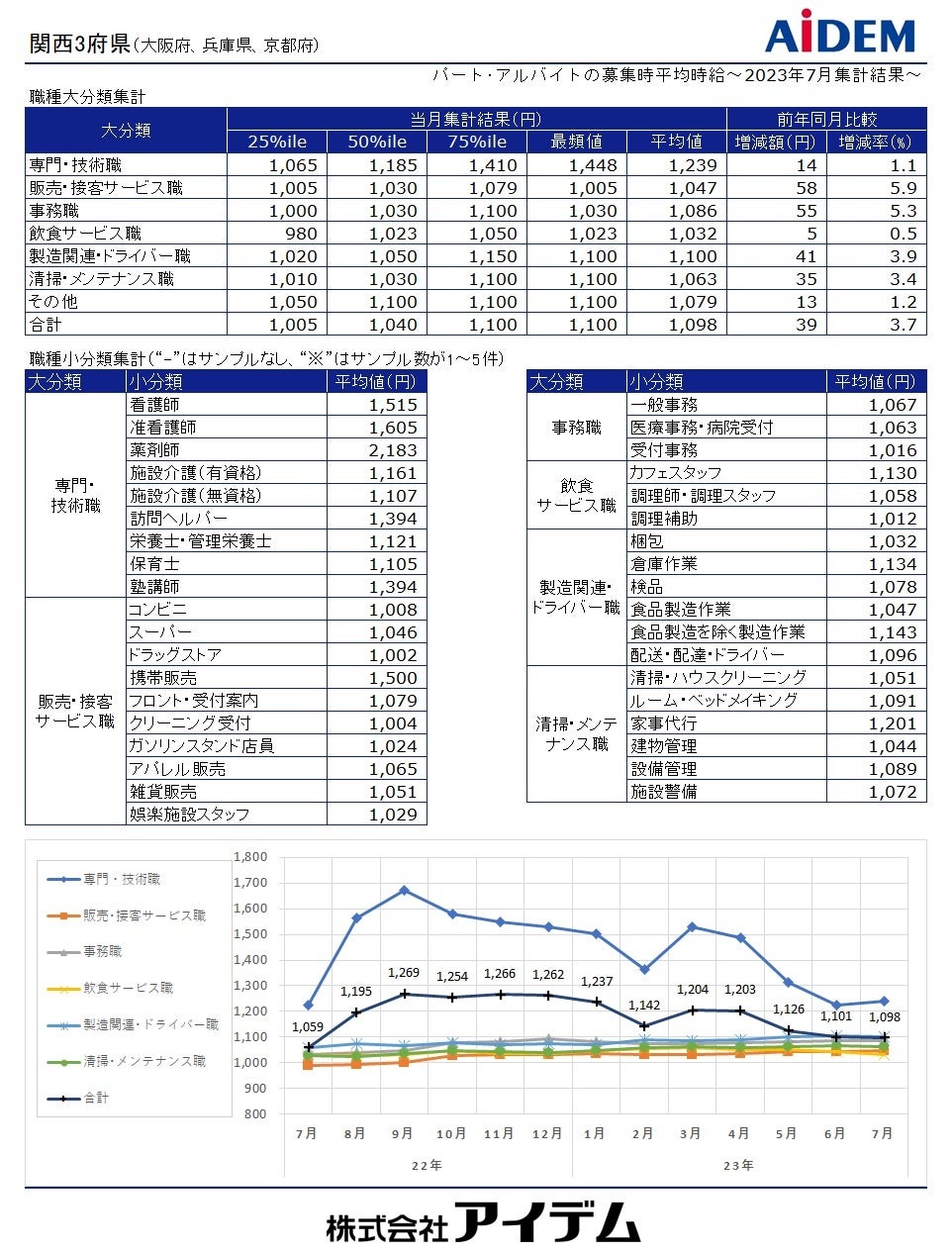 職種大分類別の平均時給は、「専門・技術職」1,239円(前年同月比14円増)、「製造関連・ドライバー職」1,100円(同41円増)、「事務職」1,086円(同55円増)、「清掃・メンテナンス職」1,063円(同35円増)、「販売・接客サービス職」1,047円(同58円増)、「飲食サービス職」1,032円(同5円増)の順で、前年同月比で全ての職種がプラスとなった。府県別の平均時給は、大阪府1,137円(前年同月比45円増)、京都府1,073円(同30円増)、兵庫県1,054円(同36円増)の順となり、前年同月比で全ての府県がプラスとなった。
