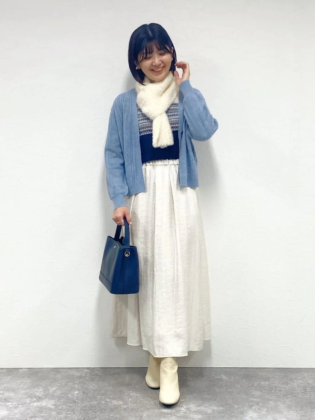 冬にぴったりなフェアアイル柄ニットに、柄の配色とマッチするサックスブルーのカーディガンをオン。ホワイトの小物やボトムを合わせて、ニットのクリアな発色を引き立てました。カーディガンはボレロ感覚で羽織れるコンパクトな着丈で、ロングスカートともバランス良くマッチします。ファーマフラーをプラスして、防寒+華やかさもアップ。