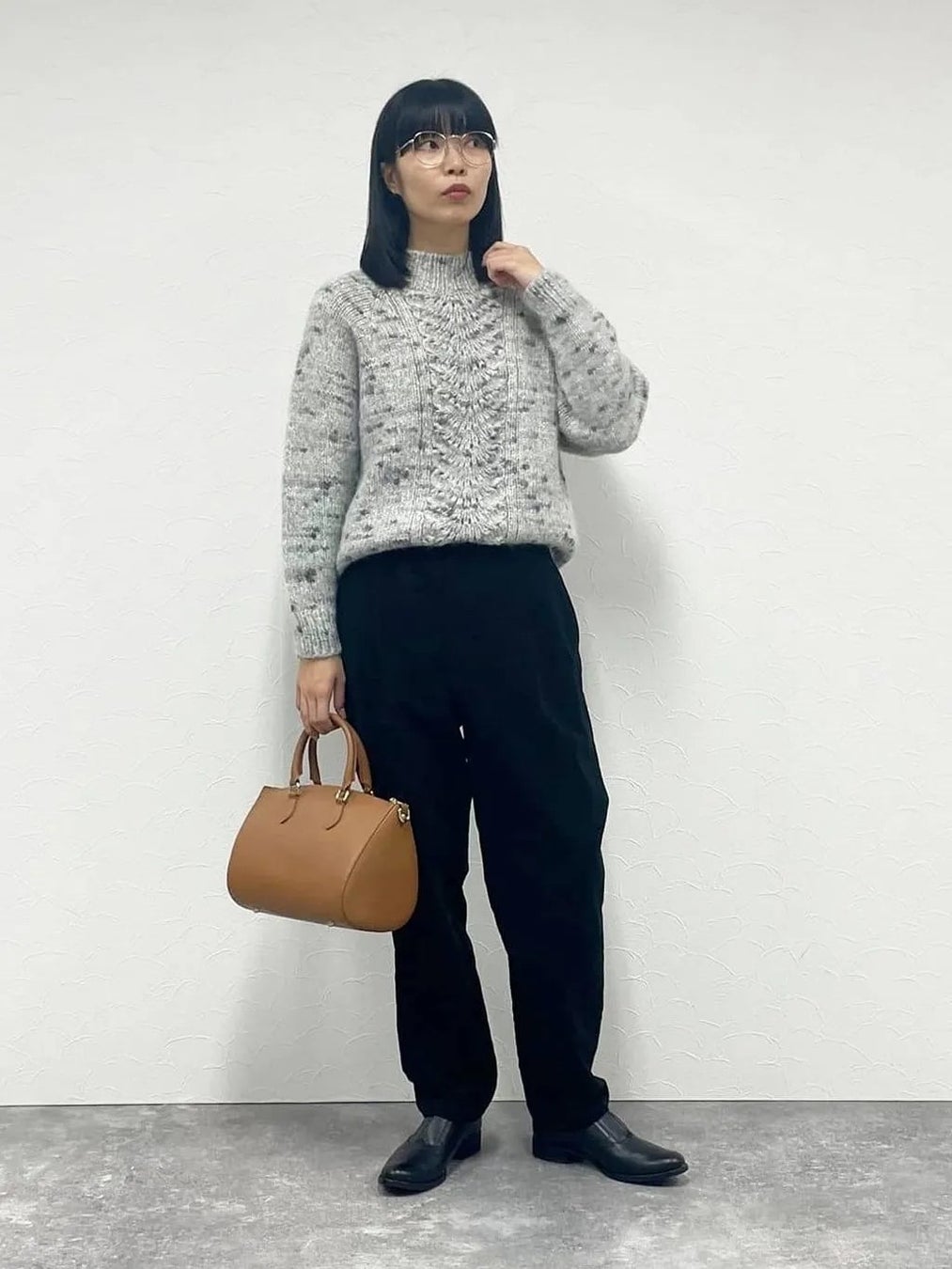 縄編みやランダムなカラーネップなど、ニットならではの表情が魅力のプルオーバー。全体をモノトーンでまとめることで、ナチュラルな中にもシックな雰囲気をプラスしました。パンツはニットと好相性な温かみのあるモールスキン素材で、ニットのデザイン性と繊細なテクニックに視線を集めます。