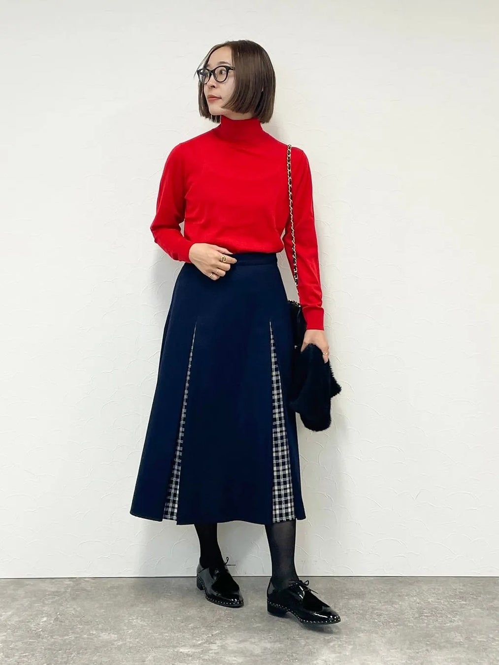 冬に映える赤のカラーニットは、潔く1枚でコーディネートの主役に。ハイゲージの編地が、鮮やかな発色の美しさを引き上げます。一見シンプルに見えるネイビーのスカートはニューヨーカータータンの部分使いがポイント。ニットの赤ともリンクして、さりげなくまとまり感のある着こなしが完成します。