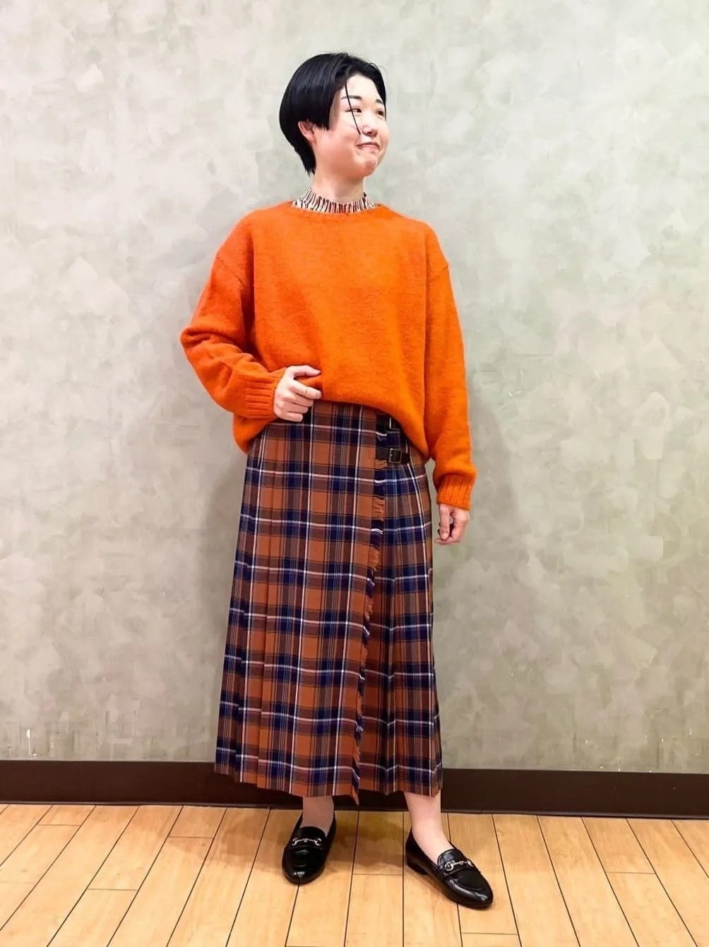 鮮やかな発色が目を惹くオレンジニットと、同系色のチェック柄スカートを合わせてまとまり感とインパクトを兼ね備えた着こなしに。アルパカ混のニットはふんわりと身体を包むシルエットで、トラッドスタイルにリラックスしたムードを与えてくれます。ハイネックのプリントトップスをインして、首元にアクセントをプラスしました。