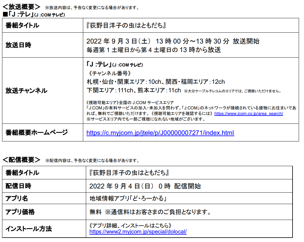 JCOM株式会社(J:COM、本社:東京都千代田区、代表取締役社長:岩木 陽一)は、荻野目洋子さんをMCにお迎えし生き物の命の大切さを伝える番組『荻野目洋子の虫はともだち』を、2022年9月3日(土)13時よりJ:COMのコミュニティチャンネル「J:テレ」(J:COM テレビ)で放送開始します。