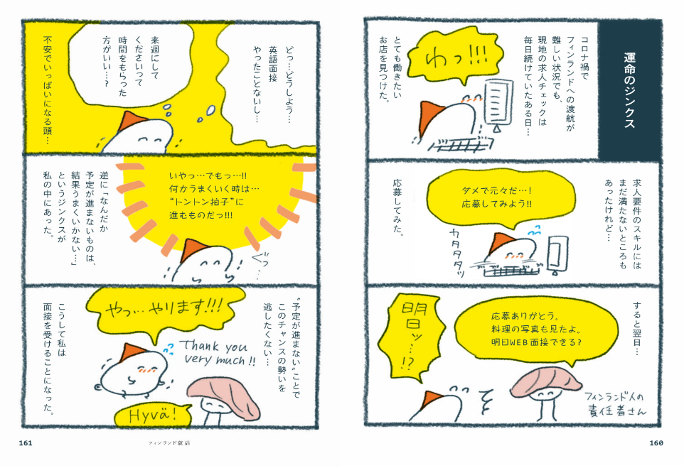 目指した夢は「フィンランドで寿司職人」。13年前の北欧への一目惚れから始まった「こじらせライフ」は、ますます加速中。SNS「週末北欧部(@cicasca)」chikaさんによる、大反響コミックエッセイ『北欧こじらせ日記』の続編『北欧こじらせ日記 移住決定編』が刊行になりました。夢を追う日々、そして叶えた先に待っていた、予測不能な景色とは…⁉ SNSで話題のエピソードに、初公開エピソードを大幅追加し、フィンランドへの愛、フィンランド就活、お寿司修業について、いよいよ始まるフィンランド生活までを、オールカラー&読みやすい糸綴じ製本でお届けします。https://www.sekaibunka.com/book/exec/cs/22502.html- 何かうまくいく時は...“トントン拍子”に進むものだっ!!