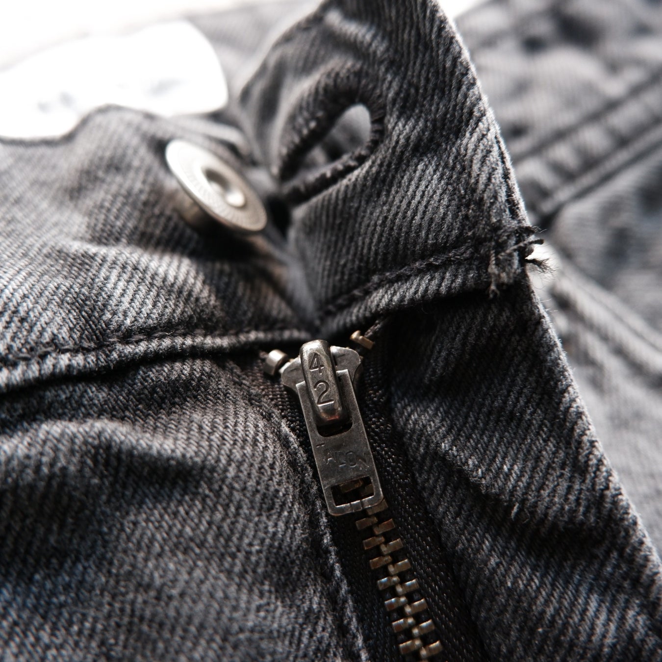 →インディゴ同様ストーンウォッシュをかけて風合いを表現していますが、ブラックデニムによく見られる黒(縦糸)×白(横糸)とは異なり黒(縦糸)×黒(横糸)のデニム素材を使用することで、加工後の色ムラが少なく、モダンかつ上品にお召いただくことが出来る仕上がりとなっております 。