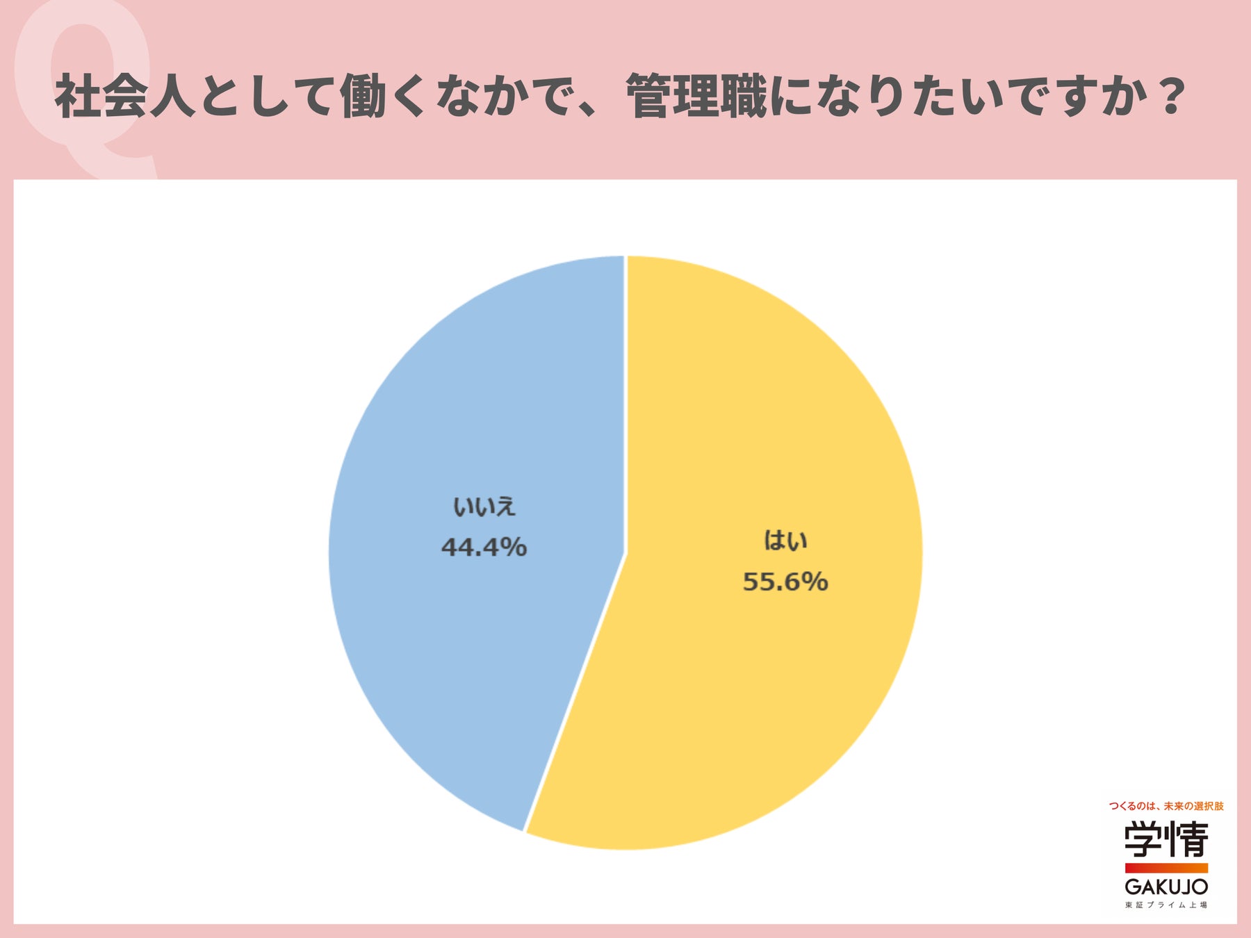 「社会人として働くなかで、管理職になりたいですか?」という質問に対し、「はい」と回答した新社会人が55.6%に上りました。いずれは管理職になりたいと考えている新社会人が、6割に迫っています。