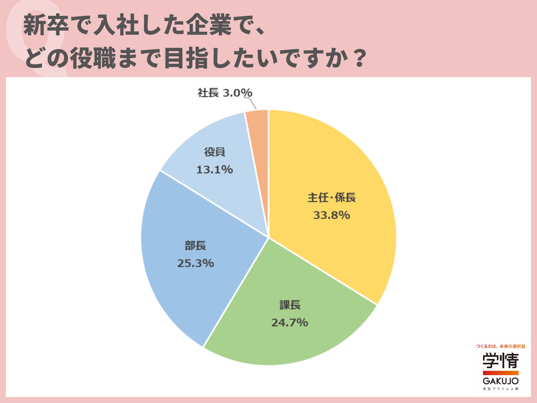 株式会社学情(本社:東京都中央区)は、2025年4月に入社を控える新社会人(以下、新社会人)を対象に、インターネットアンケートを実施。今回は、「入社先でのキャリア」について調査しました。新卒で入社した企業で働きたい年数は、「定年まで働きたい」が最多。約半数が、「10年以上」働きたいと回答しています。「定年まで」に次いで回答を集めたのは、「3年以上5年未満」でした。「現時点では長く働きたいと思っているが、ライフステージが変わったら転職する可能性はある」「30歳になる前にそれまでのキャリアを見直して、転職するかしないかを考えたい」「長く働きたいものの、自分がより成長できそうな企業に出会った場合は、転職も検討する」などの声も寄せられました。「必ず転職する」と決めているわけではないものの、その時その時でベストな選択をしたいという意向もうかがえます。新卒で入社した企業で目指したい役職は、「主任・係長」が最多となりました。