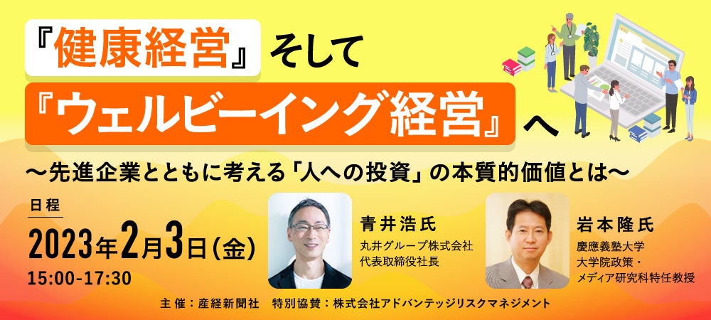 産経新聞社(東京都千代田区、社長・近藤哲司)は、セミナー「『健康経営』そして『ウェルビーイング経営』へ~先進企業とともに考える『人への投資』の本質的価値とは~」を、2023年2月3日(金)15時からJPタワー ホール&カンファレンス(東京都千代田区)で開催(※オンライン同時配信)。参加者を募集します。