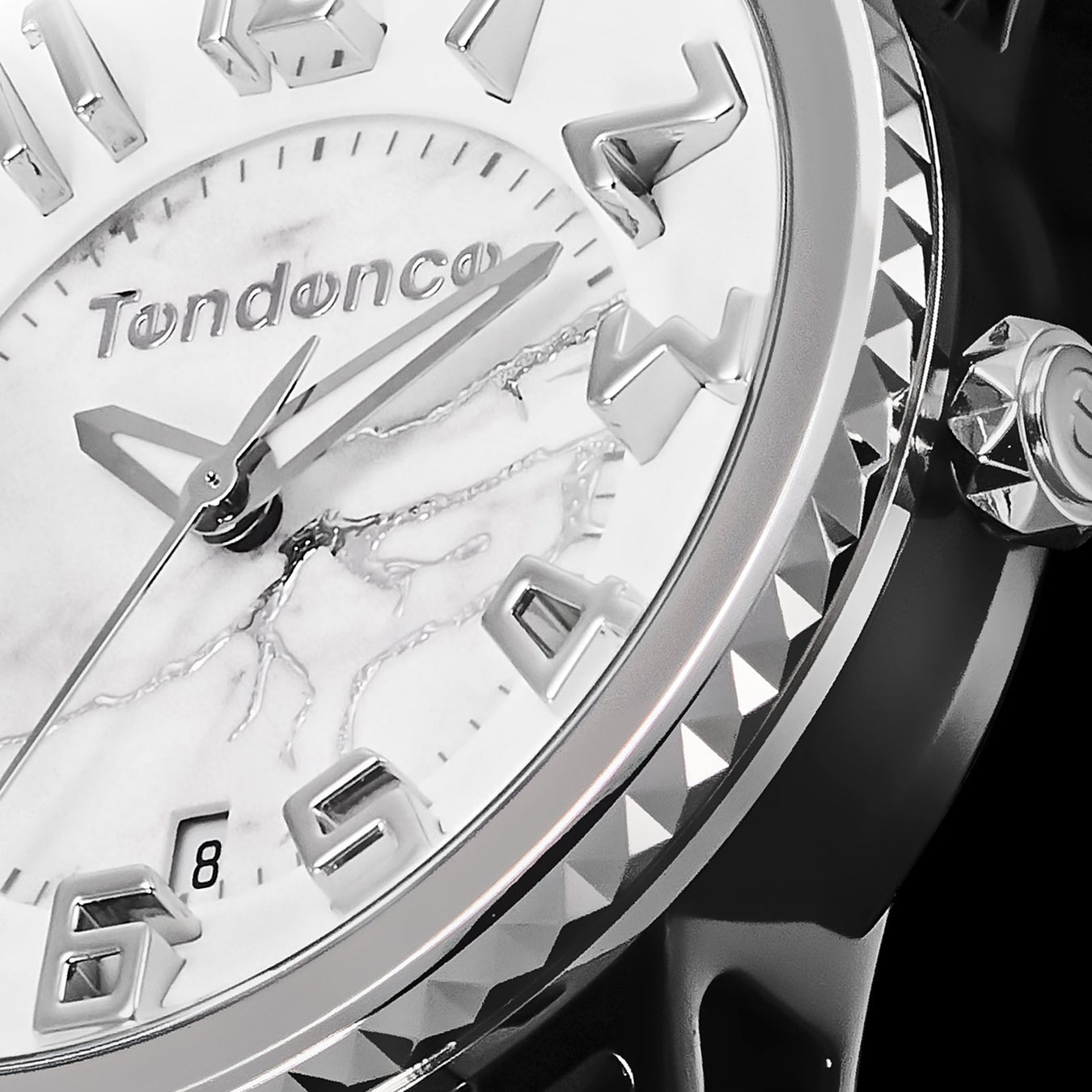 テンデンスのラインナップの中ではコンパクトな41mmサイズのコレクション「GULLIVER Round 41mm」をベースに誕生した本モデルは、文字盤中央に高級感とエレガンスな印象を与える大理石風のマーブル模様がデザインされています。